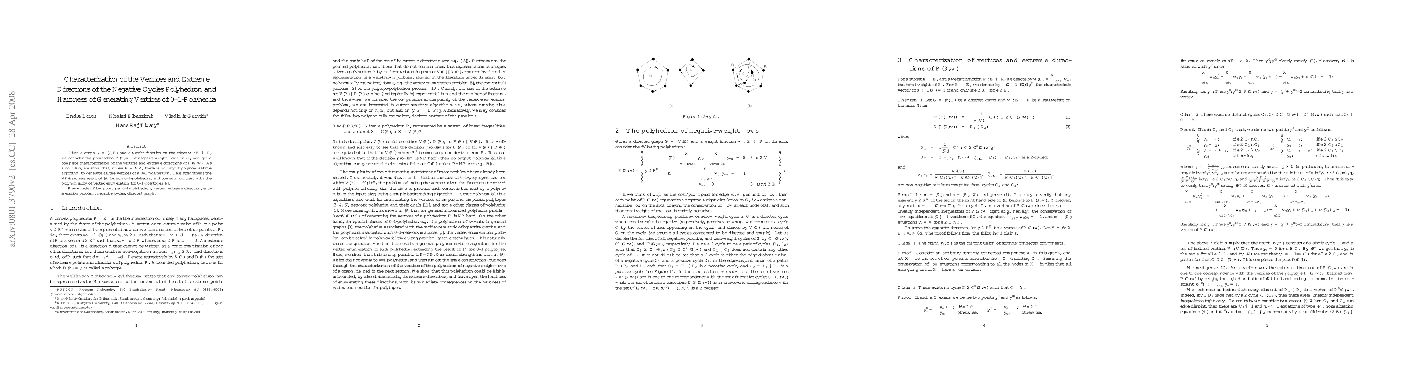 Summary: The paper characterizes the vertices and extreme directions of the negative cycles polyhedron for weighted graphs, proving that generating all vertices of a 0/1-polyhedron is NP-hard, reinforcing previous hardness results and contrasting with the polynomial enumeration for 0/1-polytopes.