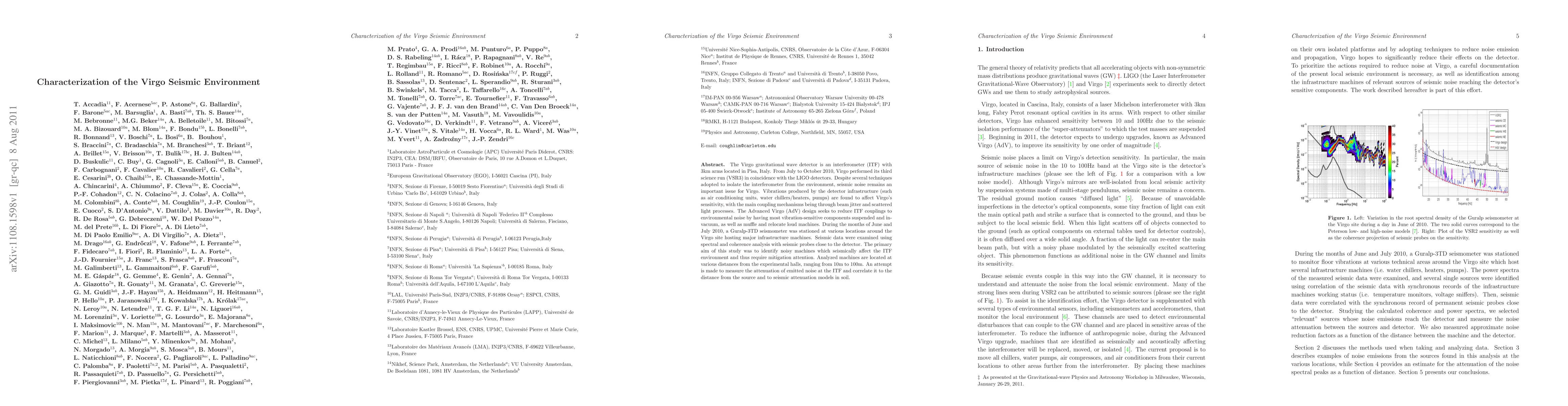 The Virgo gravitational wave detector is an interferometer (ITF) with 3km arms located in Pisa, Italy. From July to October 2010, Virgo performed its third science run (VSR3) in coincidence with the LIGO detectors. Despite several techniques adopted to isolate the interferometer from the environment, seismic noise remains an important issue for Virgo. Vibrations produced by the detector infrastructure (such as air conditioning units, water chillers/heaters, pumps) are found to affect Virgo's sensitivity, with the main coupling mechanisms being through beam jitter and scattered light processes. The Advanced Virgo (AdV) design seeks to reduce ITF couplings to environmental noise by having most vibration-sensitive components suspended and in-vacuum, as well as muffle and relocate loud machines. During the months of June and July 2010, a Guralp-3TD seismometer was stationed at various locations around the Virgo site hosting major infrastructure machines. Seismic data were examined using spectral and coherence analysis with seismic probes close to the detector. The primary aim of this study was to identify noisy machines which seismically affect the ITF environment and thus require mitigation attention. Analyzed machines are located at various distances from the experimental halls, ranging from 10m to 100m. An attempt is made to measure the attenuation of emitted noise at the ITF and correlate it to the distance from the source and to seismic attenuation models in soil.