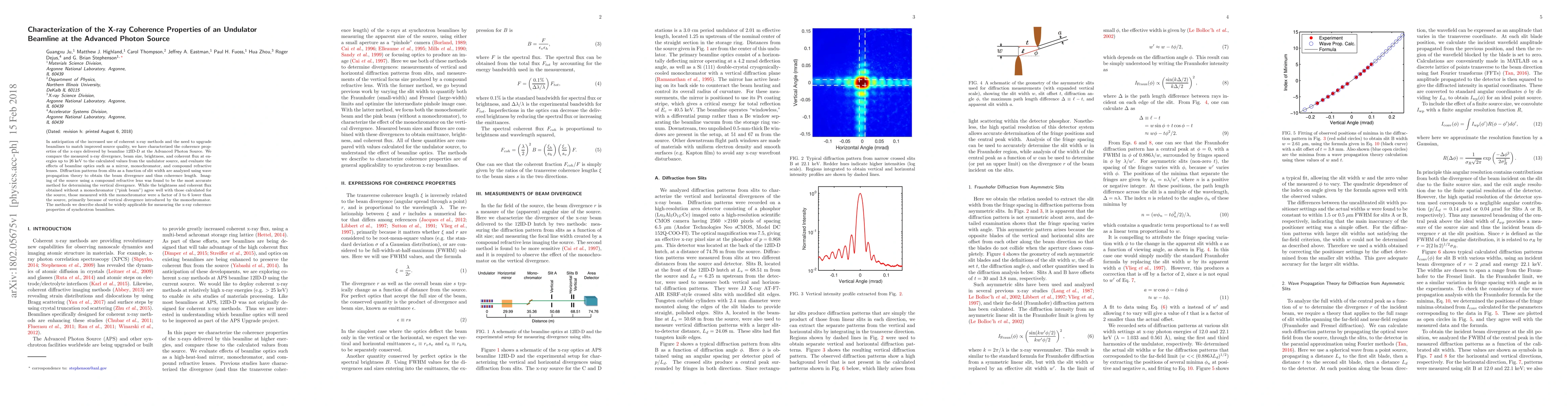 This paper characterizes the coherence properties of an undulator beamline at the Advanced Photon Source, comparing measured x-ray divergence, beam size, brightness, and coherent flux to calculated values. It finds that imaging with a compound refractive lens is most accurate for determining vertical divergence, while monochromators introduce significant vertical divergence, reducing brightness and coherent flux by a factor of 3 to 6.