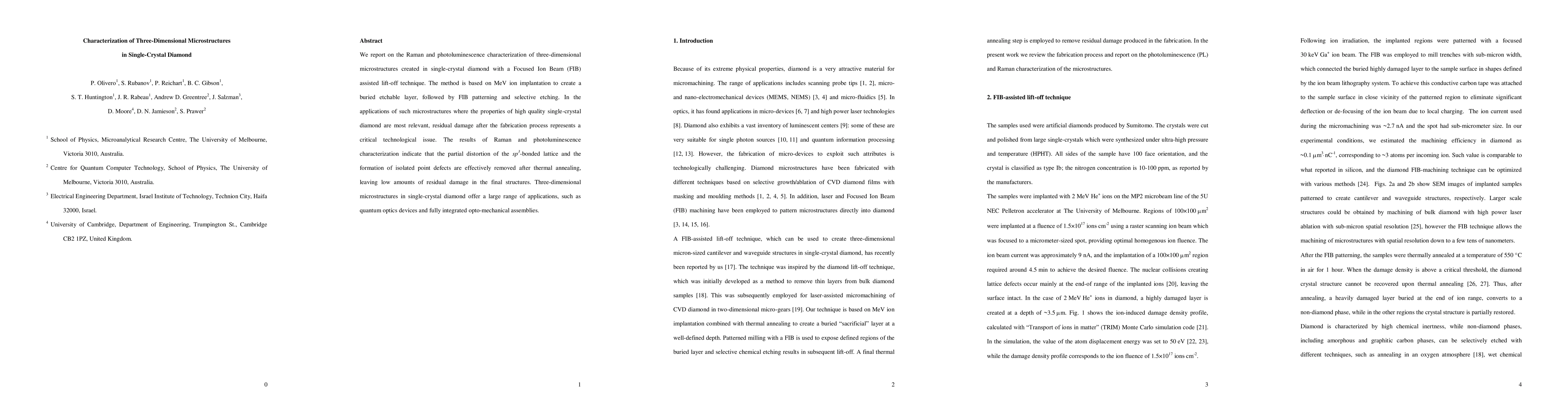 This paper characterizes three-dimensional microstructures in single-crystal diamond created via FIB-assisted lift-off, with Raman and photoluminescence analysis showing effective removal of residual damage post-annealing. These microstructures hold potential for applications in quantum optics and integrated opto-mechanical systems.