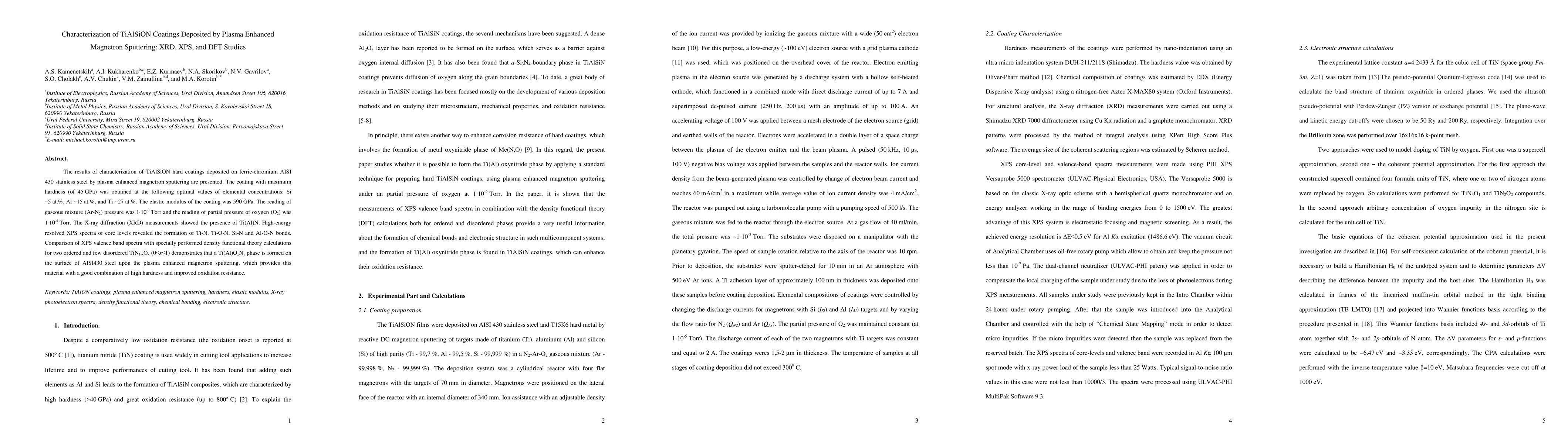 This paper characterizes TiAlSiON coatings deposited via plasma enhanced magnetron sputtering, achieving maximum hardness of 45 GPa with optimal elemental concentrations. XRD and XPS analyses reveal the formation of Ti(Al)N, Ti-N, and Si-N bonds, while DFT studies confirm the presence of a Ti(Al)OxNy phase enhancing hardness and oxidation resistance.