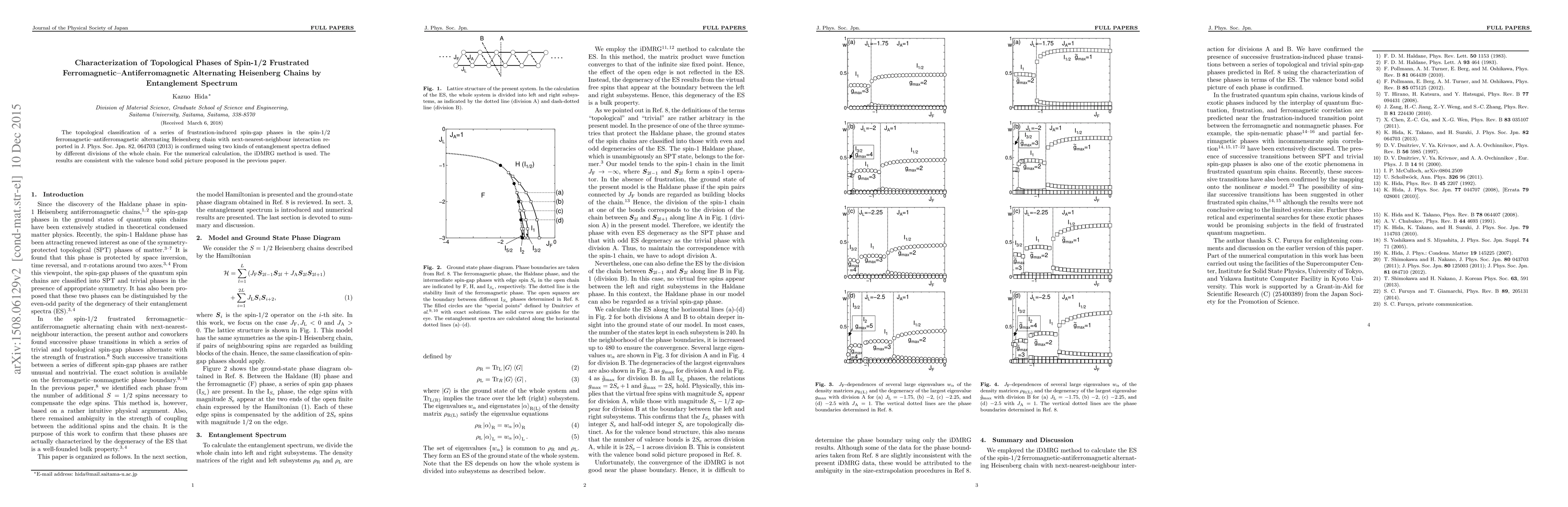 The topological classification of a series of frustration-induced spin-gap phases in the spin-1/2 ferromagnetic--antiferromagnetic alternating Heisenberg chain with next-nearest-neighbour interaction reported in J. Phys. Soc. Jpn. 82, 064703 (2013) is confirmed using two kinds of entanglement spectra defined by different divisions of the whole chain. For the numerical calculation, the iDMRG method is used. The results are consistent with the valence bond solid picture proposed in the previous paper.