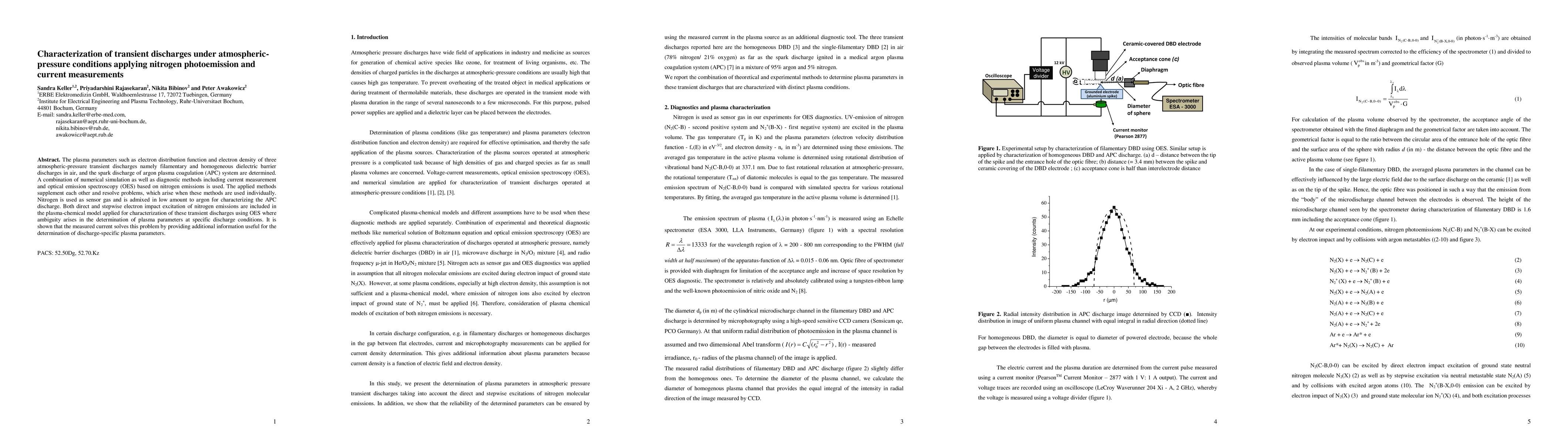 This paper characterizes transient discharges under atmospheric pressure using nitrogen photoemission and current measurements. It combines numerical simulations and diagnostic methods to determine plasma parameters for filamentary, homogeneous dielectric barrier discharges, and spark discharges in air, resolving ambiguities in plasma parameter determination.
