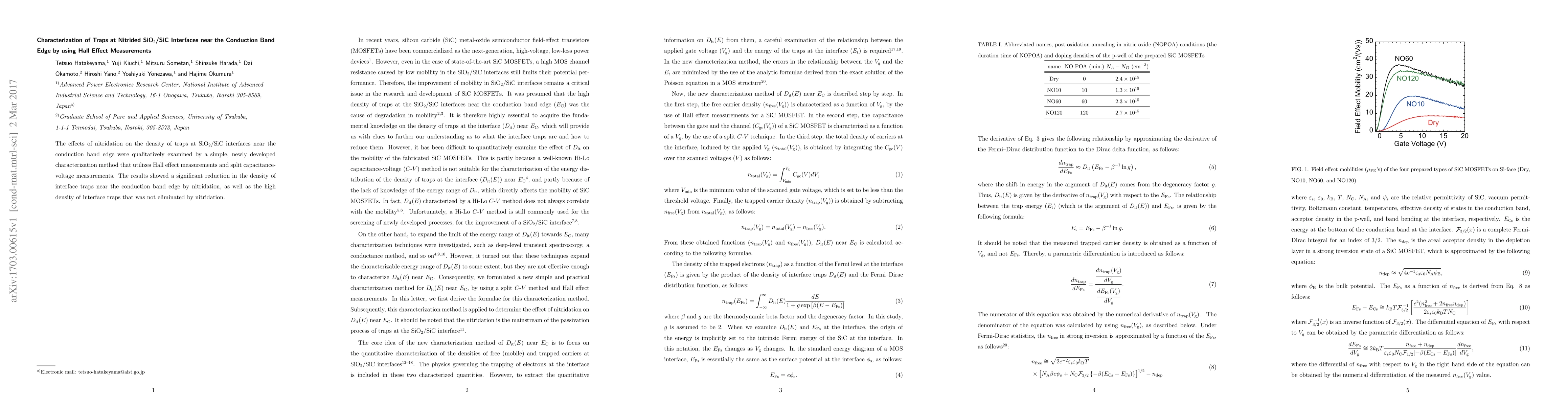 The effects of nitridation on the density of traps at SiO$_2$/SiC interfaces near the conduction band edge were qualitatively examined by a simple, newly developed characterization method that utilizes Hall effect measurements and split capacitance-voltage measurements. The results showed a significant reduction in the density of interface traps near the conduction band edge by nitridation, as well as the high density of interface traps that was not eliminated by nitridation.