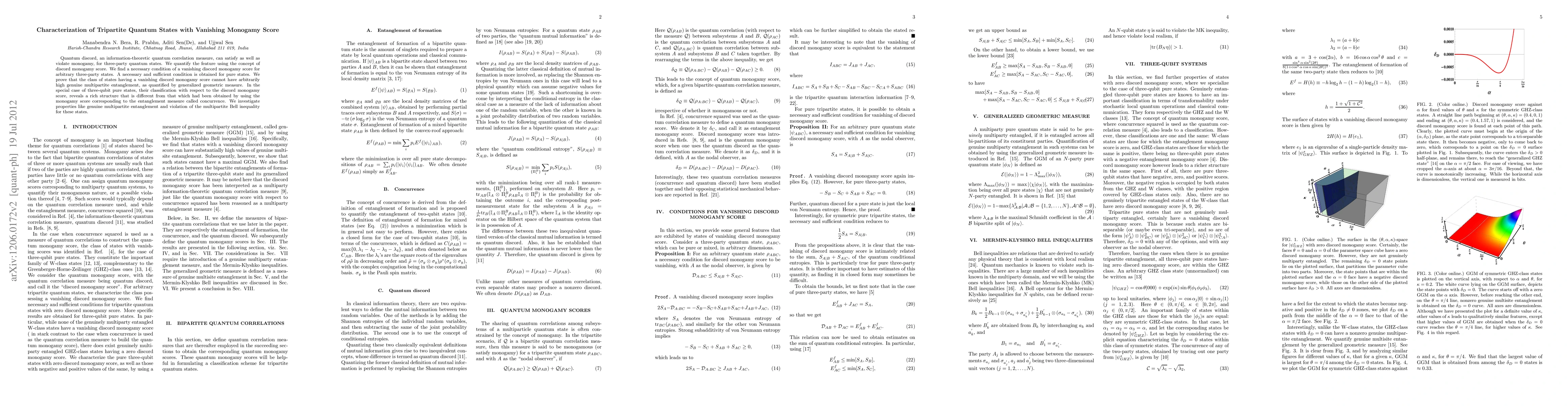 This paper characterizes tripartite quantum states with a vanishing discord monogamy score, revealing that such states cannot possess high genuine multipartite entanglement. For pure three-qubit states, it uncovers a distinct classification structure compared to that based on the concurrence monogamy score, and explores their entanglement and Bell inequality properties.