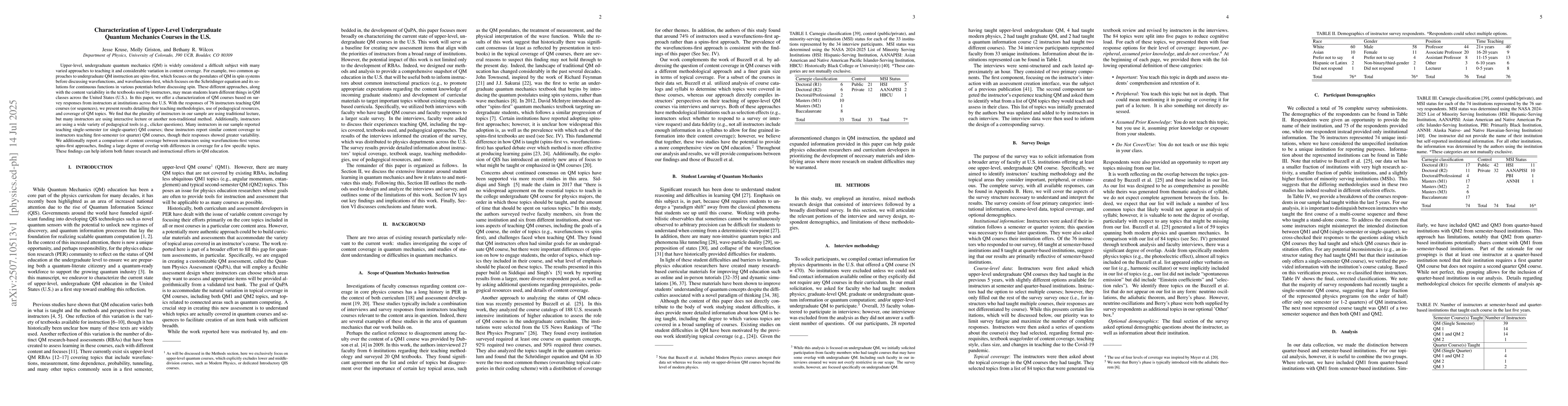 Upper-level, undergraduate quantum mechanics (QM) is widely considered a difficult subject with many varied approaches to teaching it and considerable variation in content coverage. For example, two common approaches to undergraduate QM instruction are spins-first, which focuses on the postulates of QM in spin systems before discussing wavefunctions, and wavefunctions-first, which focuses on the Schr\"odinger equation and its solutions for continuous functions in various potentials before discussing spin. These different approaches, along with the content variability in the textbooks used by instructors, may mean students learn different things in QM classes across the United States (U.S.). In this paper, we offer a characterization of QM courses based on survey responses from instructors at institutions across the U.S. With the responses of 76 instructors teaching QM courses (or sequences), we present results detailing their teaching methodologies, use of pedagogical resources, and coverage of QM topics. We find that the plurality of instructors in our sample are using traditional lecture, but many instructors are using interactive lecture or another non-traditional method. Additionally, instructors are using a wide variety of pedagogical tools (e.g., clicker questions). Many instructors in our sample reported teaching single-semester (or single-quarter) QM courses; these instructors report similar content coverage to instructors teaching first-semester (or quarter) QM courses, though their responses showed greater variability. We additionally report a comparison of content coverage between instructors using wavefunctions-first versus spins-first approaches, finding a large degree of overlap with differences in coverage for a few specific topics. These findings can help inform both future research and instructional efforts in QM education.