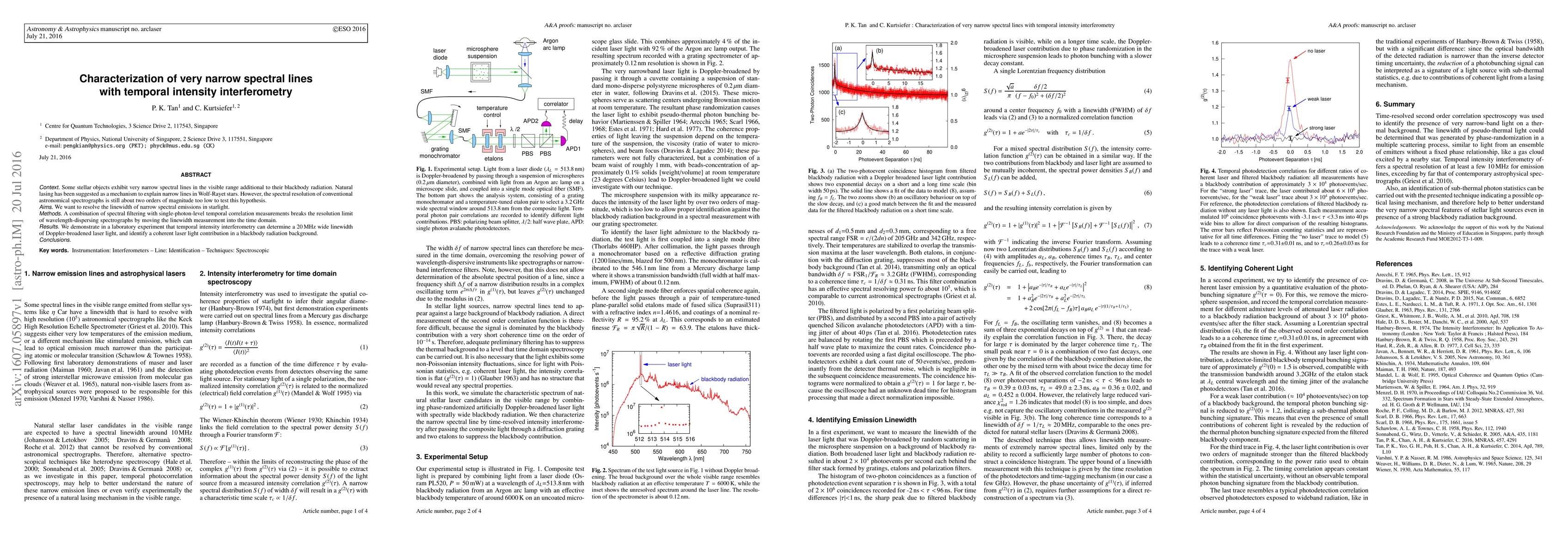 This paper investigates the use of temporal intensity interferometry to characterize very narrow spectral lines in stellar objects, demonstrating its ability to resolve linewidths beyond conventional spectrographs' limits and identifying a coherent laser light contribution in a blackbody radiation background.