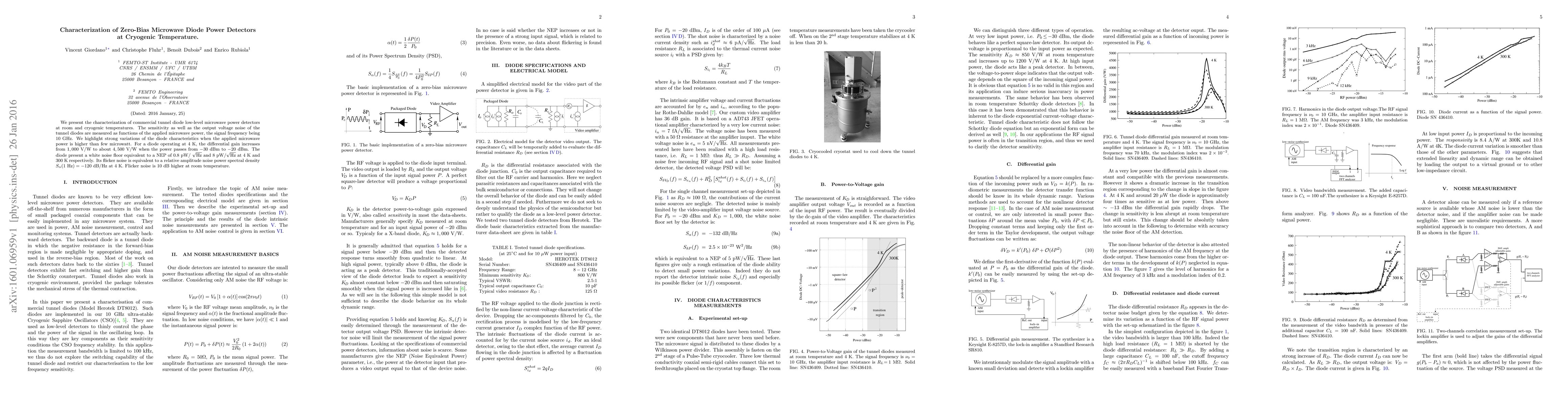 Researchers characterized commercial tunnel diode microwave power detectors at cryogenic temperatures, finding significant variations in sensitivity and output noise with increasing applied microwave power. The detectors exhibited a white noise floor equivalent to 0.8 pW/√Hz at 4K and 8 pW/√Hz at room temperature.