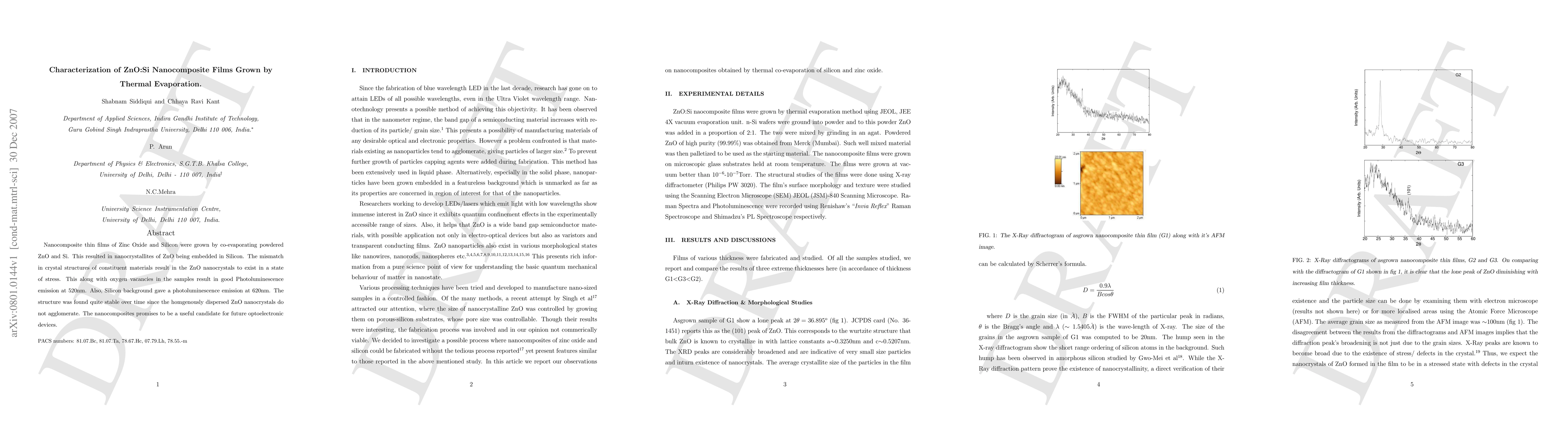 Nanocomposite thin films of Zinc Oxide and Silicon were grown by co-evaporating powdered ZnO and Si. This resulted in nanocrystallites of ZnO being embedded in Silicon. The mismatch in crystal structures of constituent materials result in the ZnO nanocrystals to exist in a state of stress. This along with oxygen vacancies in the samples result in good Photoluminescence emission at 520nm. Also, Silicon background gave a photoluminescence emission at 620nm. The structure was found quite stable over time since the homgenously dispersed ZnO nanocrystals do not agglomerate. The nanocomposites promises to be a useful candidate for future optoelectronic devices.