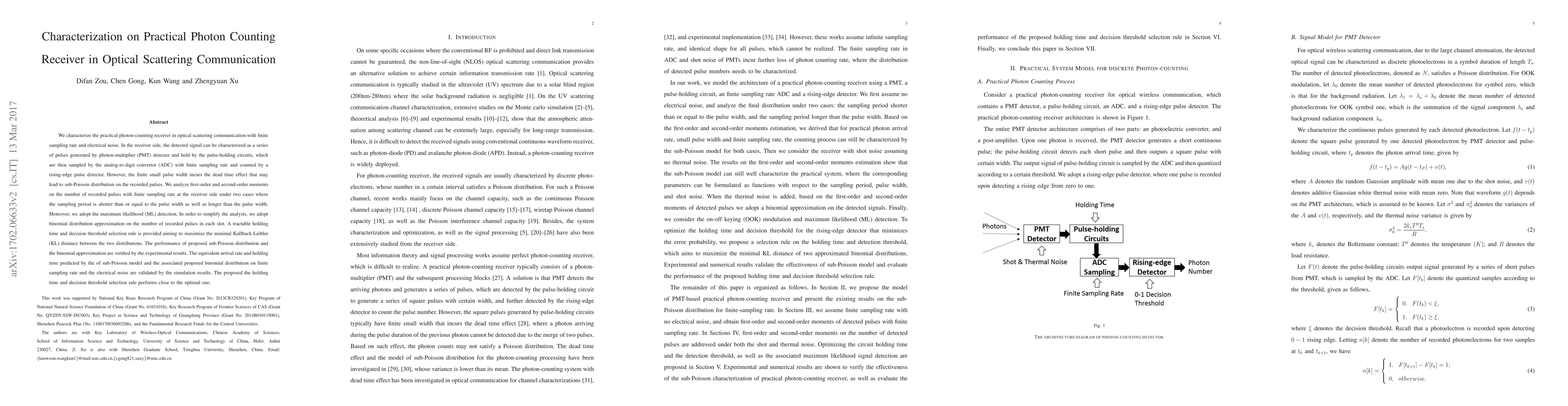 We characterize the practical photon-counting receiver in optical scattering communication with finite sampling rate and electrical noise. In the receiver side, the detected signal can be characterized as a series of pulses generated by photon-multiplier (PMT) detector and held by the pulse-holding circuits, which are then sampled by the analog-to-digit convertor (ADC) with finite sampling rate and counted by a rising-edge pulse detector. However, the finite small pulse width incurs the dead time effect that may lead to sub-Poisson distribution on the recorded pulses. We analyze first-order and second-order moments on the number of recorded pulses with finite sampling rate at the receiver side under two cases where the sampling period is shorter than or equal to the pulse width as well as longer than the pulse width. Moreover, we adopt the maximum likelihood (ML) detection. In order to simplify the analysis, we adopt binomial distribution approximation on the number of recorded pulses in each slot. A tractable holding time and decision threshold selection rule is provided aiming to maximize the minimal Kullback-Leibler (KL) distance between the two distributions. The performance of proposed sub-Poisson distribution and the binomial approximation are verified by the experimental results. The equivalent arrival rate and holding time predicted by the of sub-Poisson model and the associated proposed binomial distribution on finite sampling rate and the electrical noise are validated by the simulation results. The proposed the holding time and decision threshold selection rule performs close to the optimal one.