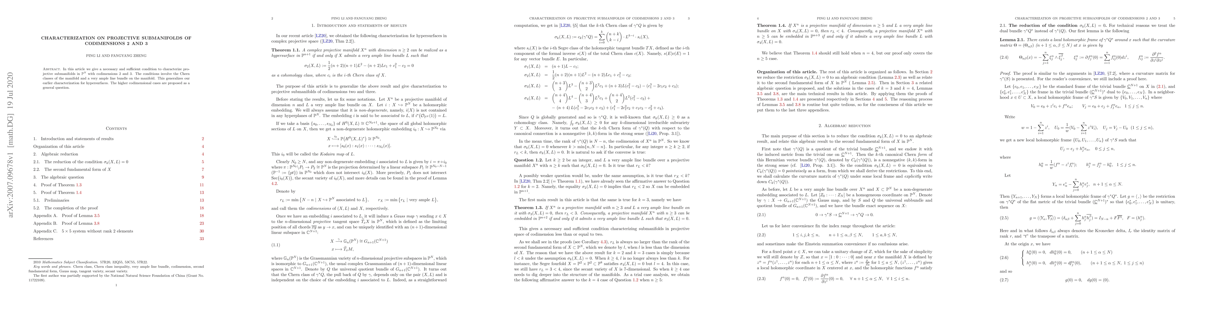 In this article we give a necessary and sufficient condition to characterize projective submanifolds in ${\mathbb P}^N$ with codimensions 2 and 3. The conditions involve the Chern classes of the manifold and a very ample line bundle on the manifold. This generalizes our earlier characterization for hypersurfaces. The higher codimensional cases are proposed as a general question.