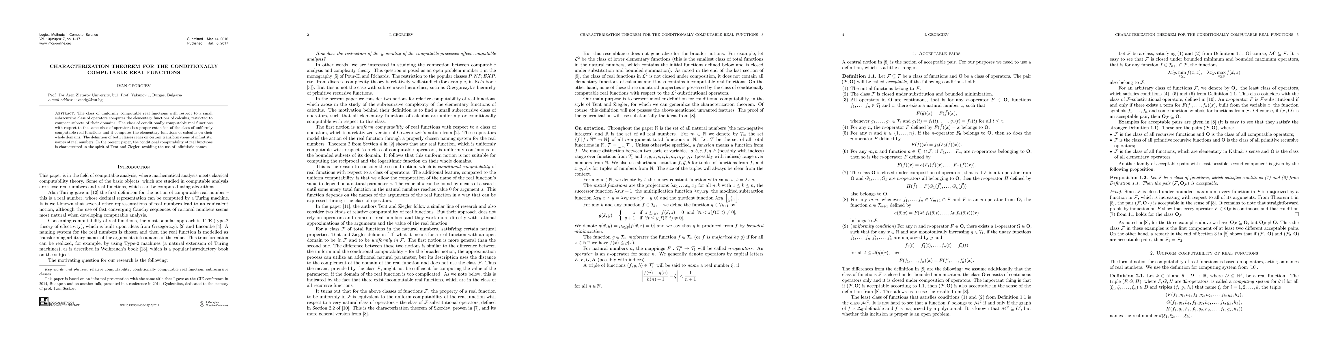 This paper characterizes the class of conditionally computable real functions, showing it extends uniformly computable functions by computing elementary calculus functions over entire domains, without relying on infinitistic names. The characterization aligns with the methods of Tent and Ziegler.
