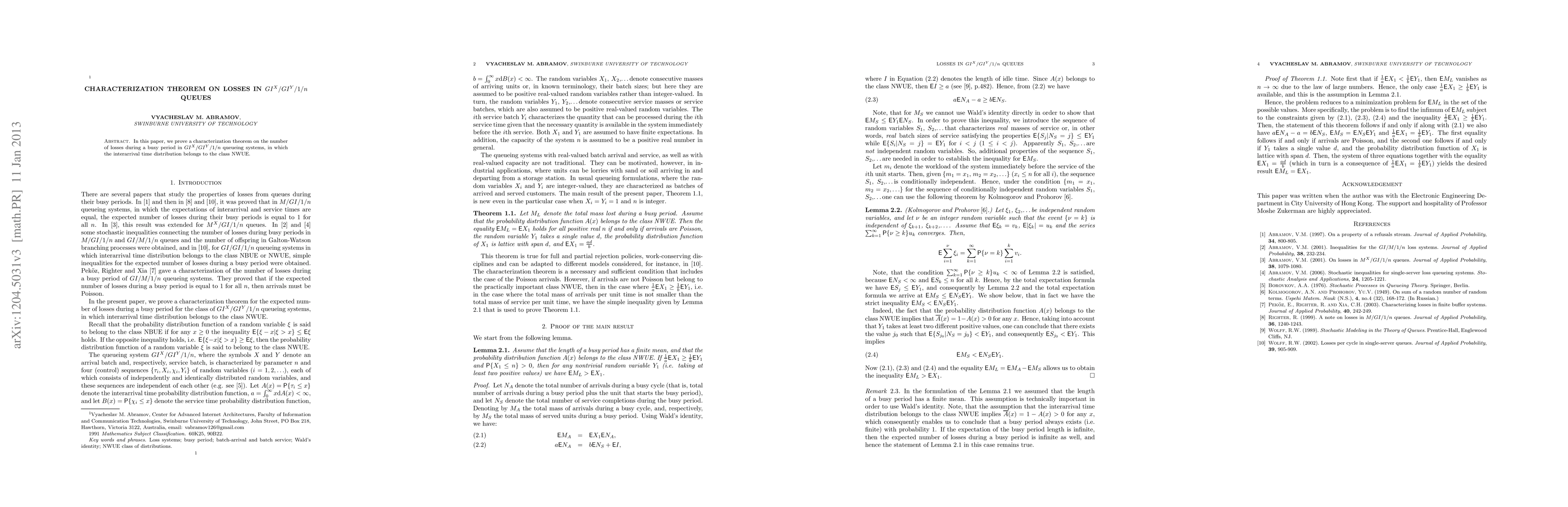 Summary: This paper proves a characterization theorem for the number of losses during a busy period in $GI^X/GI^Y/1/n$ queueing systems, where interarrival times follow a NWUE (new worse than exponential) distribution. The theorem provides insights into the loss behavior of these queues.