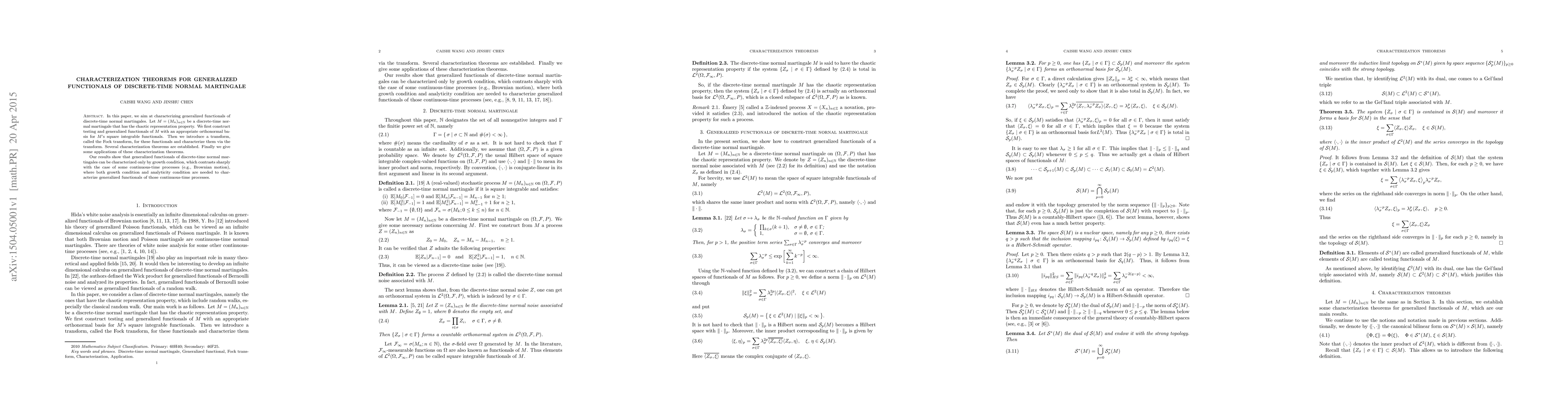 This paper characterizes generalized functionals of discrete-time normal martingales using a Fock transform, establishing characterization theorems that show these functionals depend solely on growth conditions, unlike continuous-time processes which require both growth and analyticity conditions. Applications of these theorems are also discussed.