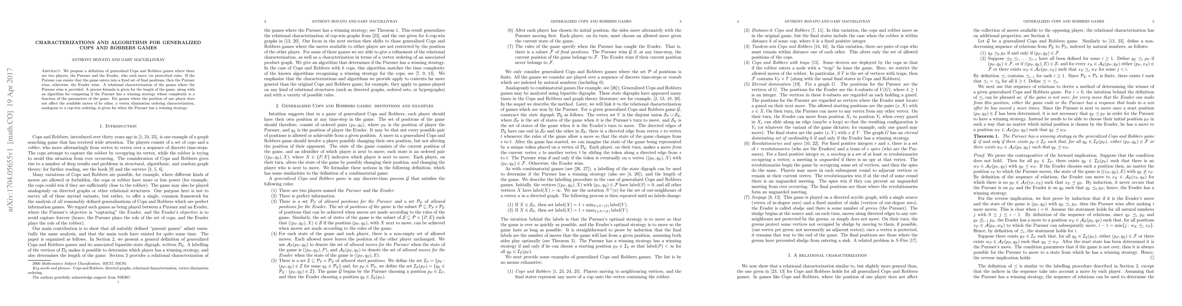 This paper introduces generalized Cops and Robbers games with defined rules for both players and provides a relational characterization for Pursuer wins. It also offers an algorithm to determine the Pursuer's winning strategy complexity and a vertex elimination method for certain game configurations.
