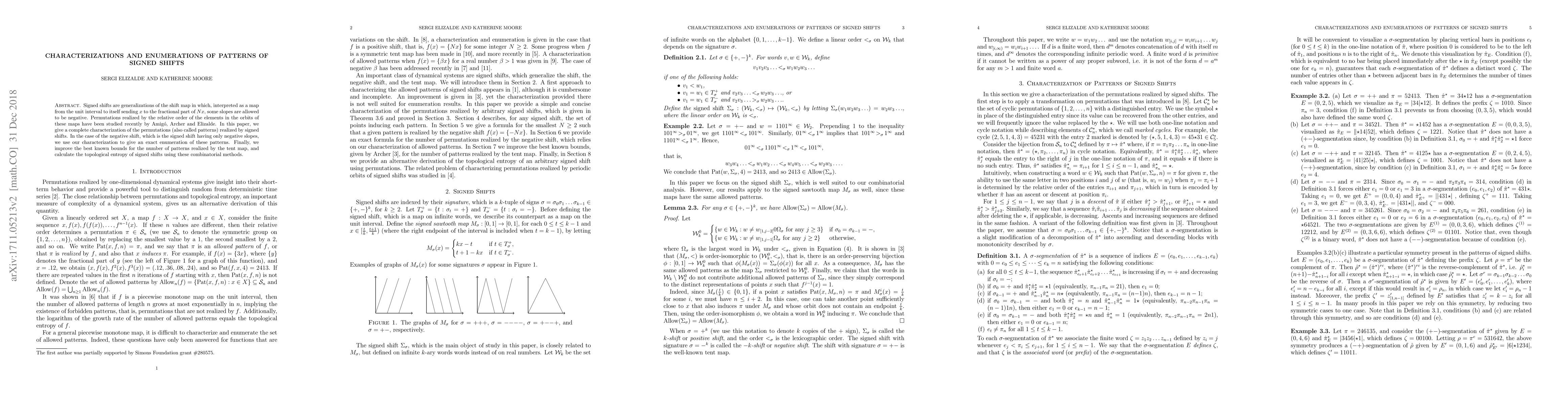This paper characterizes permutations (patterns) realized by signed shifts, which generalize shift maps with potentially negative slopes. It provides an exact enumeration of patterns for the negative shift and improves bounds for the tent map, while also calculating the topological entropy of signed shifts using combinatorial methods.
