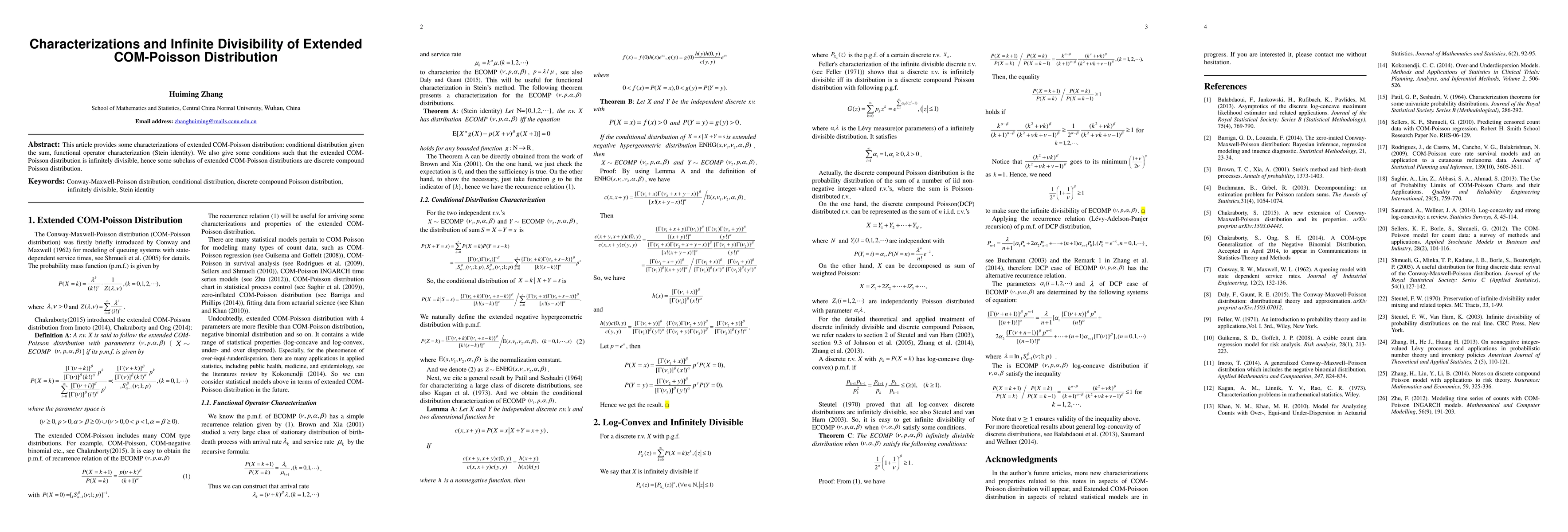 This paper characterizes the extended COM-Poisson distribution through conditional and functional operator methods, and explores its infinite divisibility, identifying conditions under which it behaves as a discrete compound Poisson distribution.