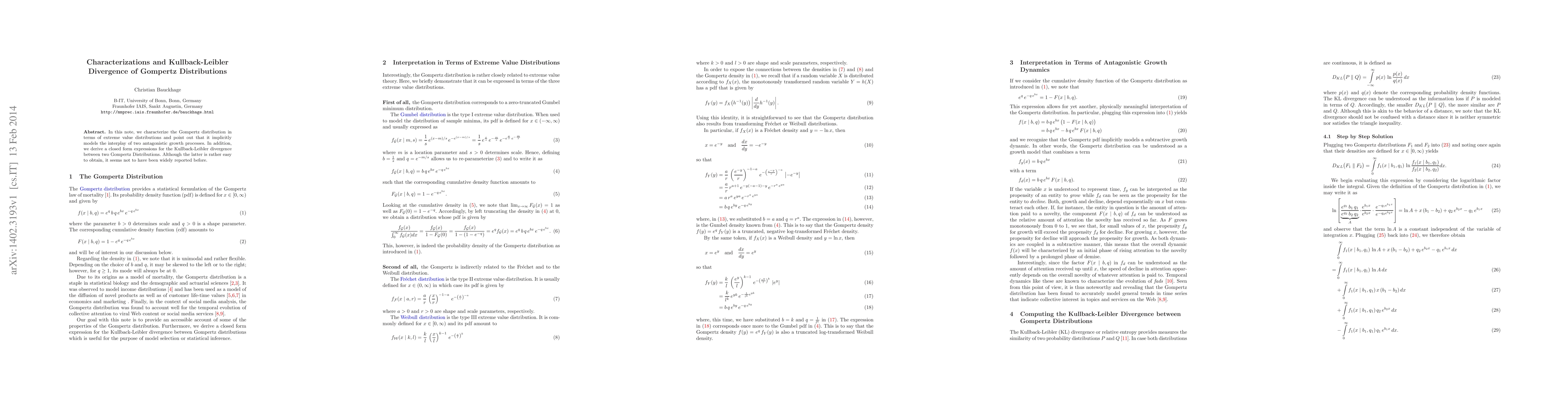 This paper characterizes the Gompertz distribution in relation to extreme value distributions and reveals its modeling of dual antagonistic growth processes. It also provides a first-time reported closed-form expression for the Kullback-Leibler divergence between two Gompertz distributions.