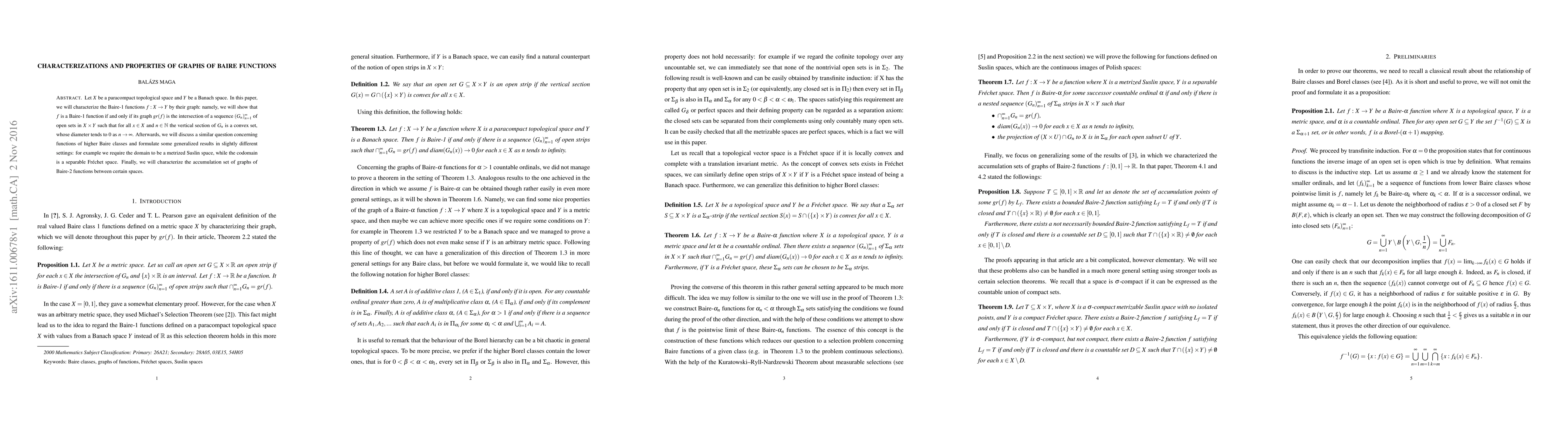 This paper characterizes Baire-1 functions by the properties of their graphs, showing they are intersections of open sets with specific vertical sections. It extends these results to higher Baire classes and discusses accumulation sets of graphs of Baire-2 functions in different settings.