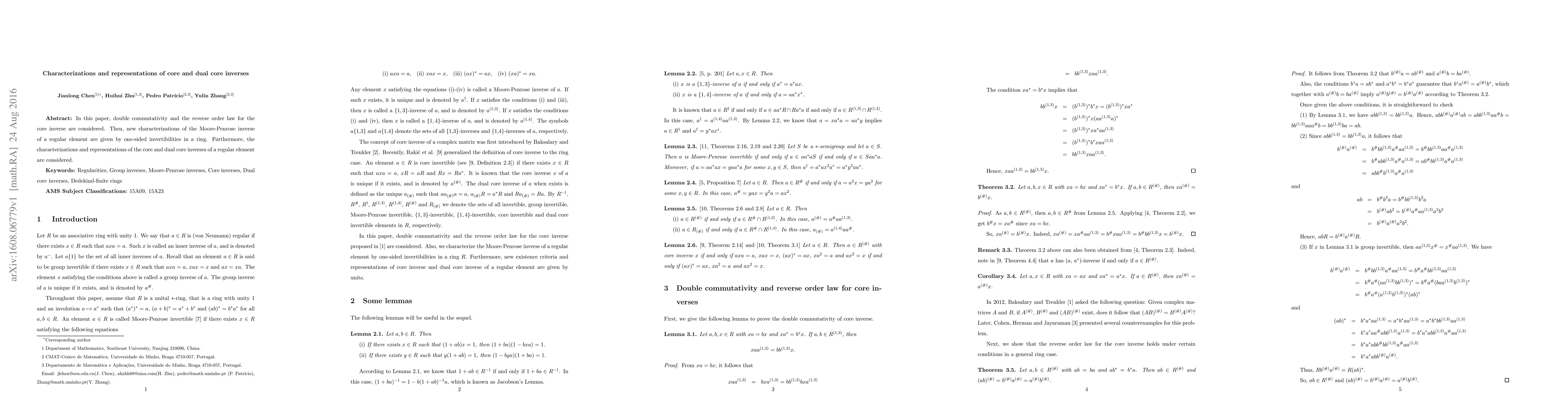 In this paper, double commutativity and the reverse order law for the core inverse are considered. Then, new characterizations of the Moore-Penrose inverse of a regular element are given by one-sided invertibilities in a ring. Furthermore, the characterizations and representations of the core and dual core inverses of a regular element are considered.