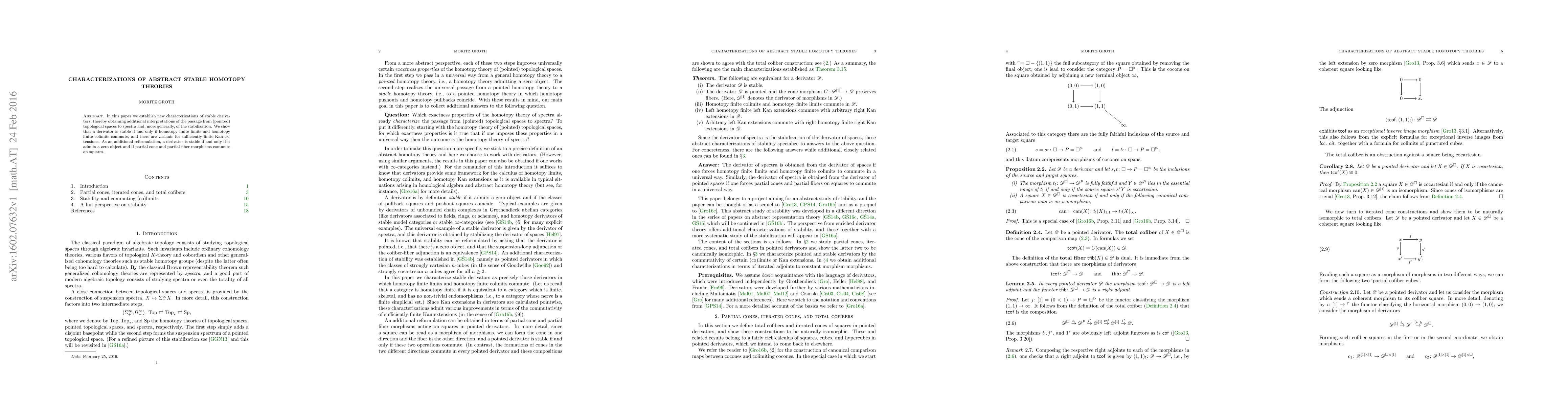 This paper provides new characterizations of stable derivators, showing they are stable if homotopy finite limits and colimits commute, with additional conditions involving Kan extensions and commutative squares.