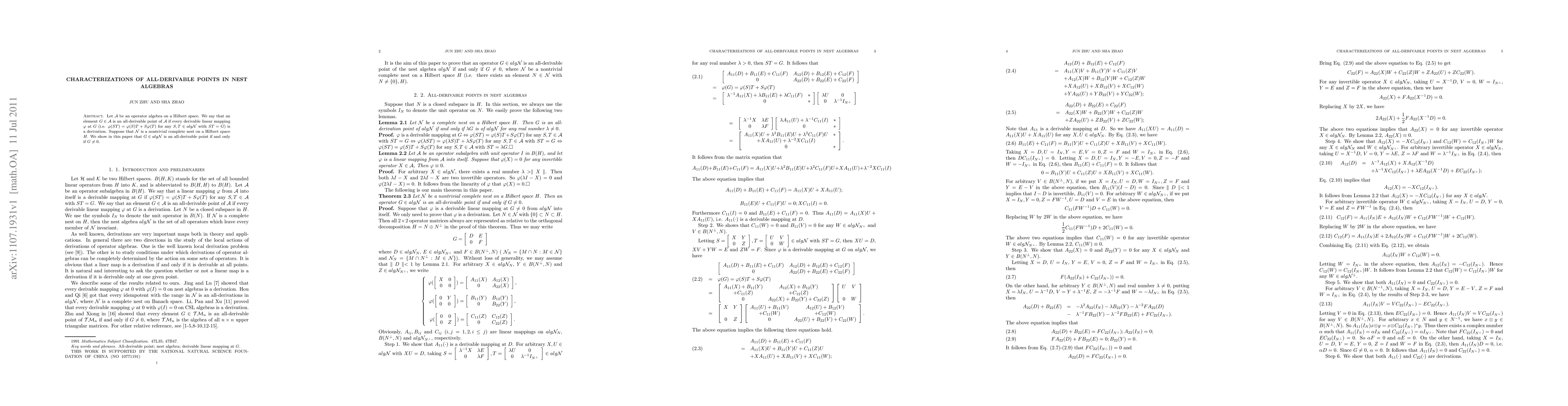 Let $\mathcal{A}$ be an operator algebra on a Hilbert space. We say that an element $G\in {\mathcal{A}}$ is an all-derivable point of ${\mathcal{A}}$ if every derivable linear mapping $\phi$ at $G$ (i.e. $\phi(ST)=\phi(S)T+S\phi(T)$ for any $S,T\in alg{\mathcal{N}}$ with $ST=G$) is a derivation. Suppose that $\mathcal{N}$ is a nontrivial complete nest on a Hilbert space $H$. We show in this paper that $G\in {alg\mathcal{N}}$ is an all-derivable point if and only if $G\neq0$.