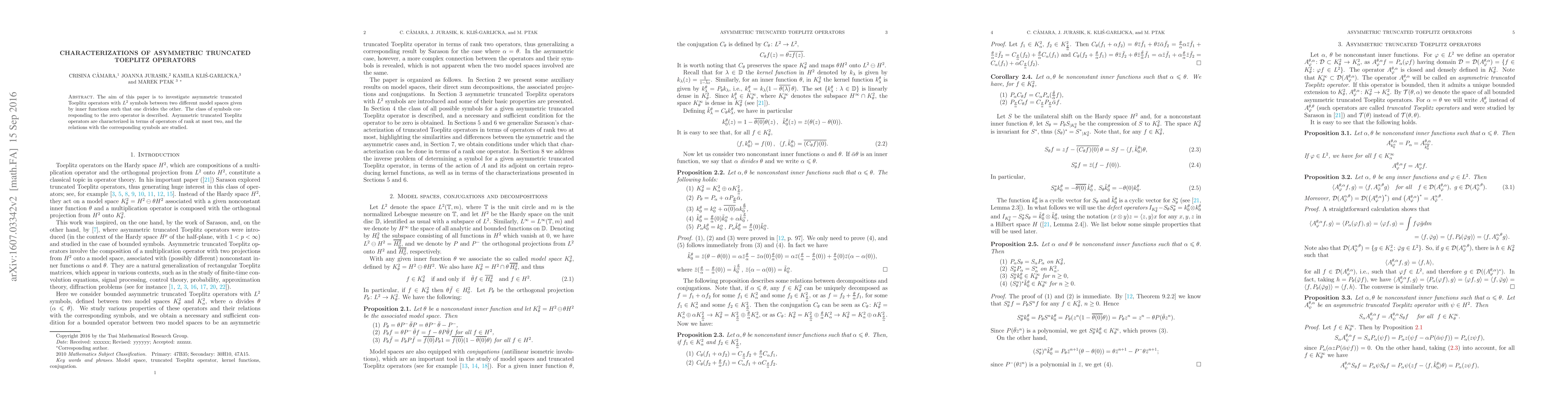 The aim of this paper is to investigate asymmetric truncated Toeplitz operators with $L^2$ symbols between two different model spaces given by inner functions such that one divides the other. Characterizations of these operators are given in terms of rank two operators. A description of the class of symbols for which the corresponding asymmetric truncated Toeplitz operator is equal to the zero operator is also given.