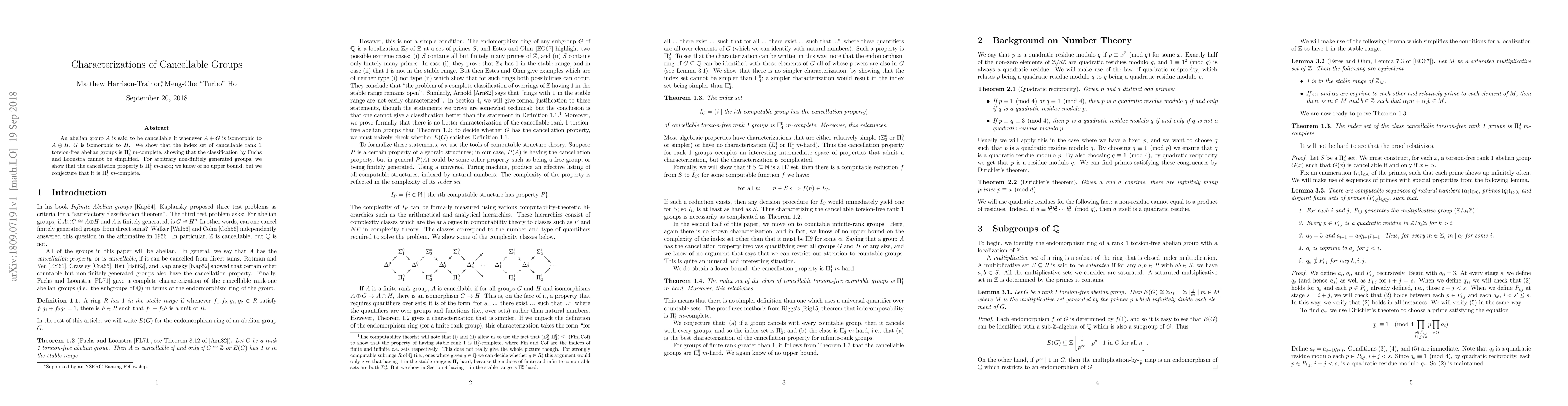 An abelian group $A$ is said to be cancellable if whenever $A \oplus G$ is isomorphic to $A \oplus H$, $G$ is isomorphic to $H$. We show that the index set of cancellable rank 1 torsion-free abelian groups is $\Pi^0_4$ $m$-complete, showing that the classification by Fuchs and Loonstra cannot be simplified. For arbitrary non-finitely generated groups, we show that the cancellation property is $\Pi^1_1$ $m$-hard; we know of no upper bound, but we conjecture that it is $\Pi^1_2$ $m$-complete.