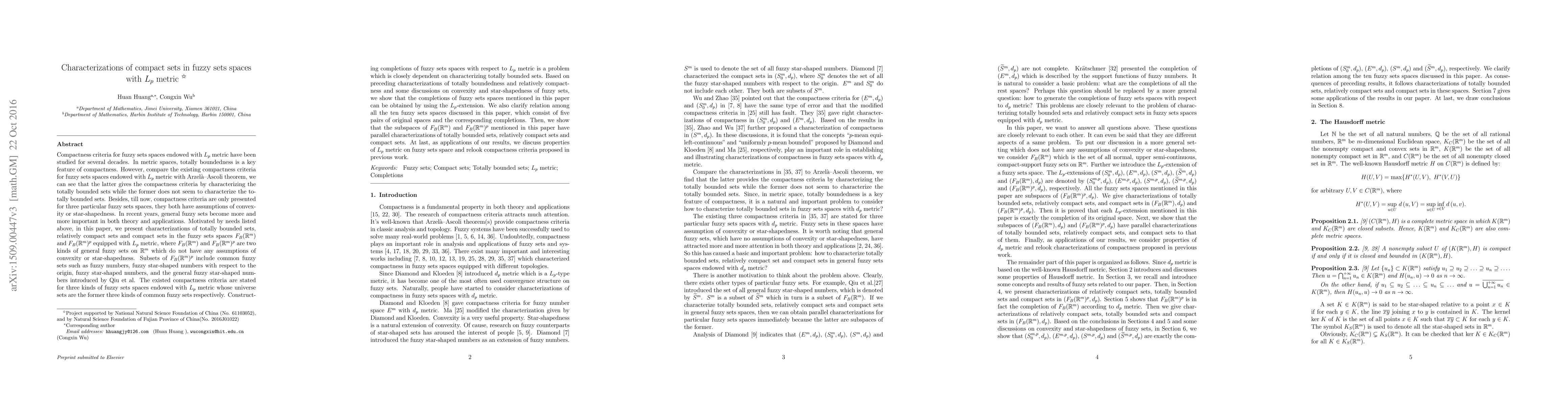 In this paper, we present characterizations of totally bounded sets, relatively compact sets and compact sets in the fuzzy sets spaces $F_B(\mathbb{R}^m)$ and $F_B(\mathbb{R}^m)^p$ equipped with $L_p$ metric, where $F_B(\mathbb{R}^m)$ and $F_B(\mathbb{R}^m)^p$ are two kinds of general fuzzy sets on $\mathbb{R}^m$ which do not have any assumptions of convexity or star-shapedness. Subsets of $F_B(\mathbb{R}^m)^p$ include common fuzzy sets such as fuzzy numbers, fuzzy star-shaped numbers with respect to the origin, fuzzy star-shaped numbers, and the general fuzzy star-shaped numbers introduced by Qiu et al. The existed compactness criteria are stated for three kinds of fuzzy sets spaces endowed with $L_p$ metric whose universe sets are the former three kinds of common fuzzy sets respectively. Constructing completions of fuzzy sets spaces with respect to $L_p$ metric is a problem which is closely dependent on characterizing totally bounded sets. Based on preceding characterizations of totally boundedness and relatively compactness and some discussions on convexity and star-shapedness of fuzzy sets, we show that the completions of fuzzy sets spaces mentioned in this paper can be obtained by using the $L_p$-extension. We also clarify relation among all the ten fuzzy sets spaces discussed in this paper, which consist of five pairs of original spaces and the corresponding completions. Then, we show that the subspaces of $F_B(\mathbb{R}^m)$ and $F_B(\mathbb{R}^m)^p$ mentioned in this paper have parallel characterizations of totally bounded sets, relatively compact sets and compact sets. At last, as applications of our results, we discuss properties of $L_p$ metric on fuzzy sets space and relook compactness criteria proposed in previous work.