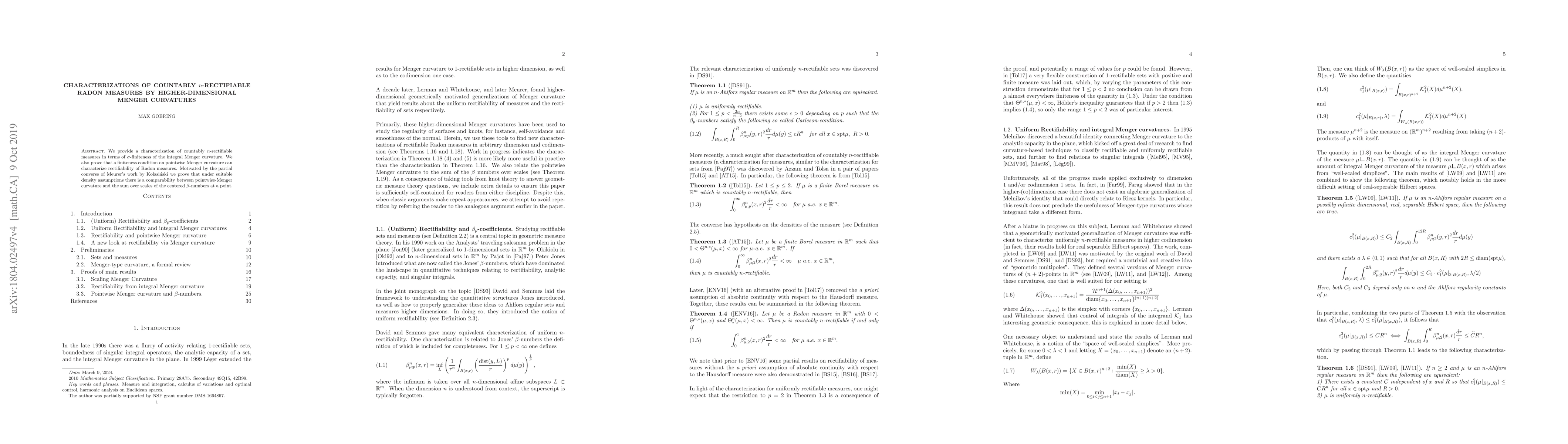 In the late `90s there was a flurry of activity relating $1$-rectifiable sets, boundedness of singular integral operators, the analytic capacity of a set, and the integral Menger curvature in the plane. In `99 Leger extended the results for Menger curvature to $1$-rectifiable sets in higher dimension, as well as to the codimension one case. A decade later, Lerman and Whitehouse, and later Meurer, found higher-dimensional geometrically motivated generalizations of Menger curvature that yield results about the uniform rectifiability of measures and the rectifiability of sets respectively. In this paper, we provide an extension of Meurer's work that yields a characterization of countably $n$-rectifiable measures in terms of $\sigma$-finiteness of the integral Menger curvature. We also prove that a finiteness condition on pointwise Menger curvature proves rectifiability of Radon measures. Finally, motivated by the partial converse of Meurer's work by Kolasinski we prove that under suitable density assumptions there is a comparability between pointwise-Menger curvature and the sum over scales of the centered $\beta$-numbers at a point.