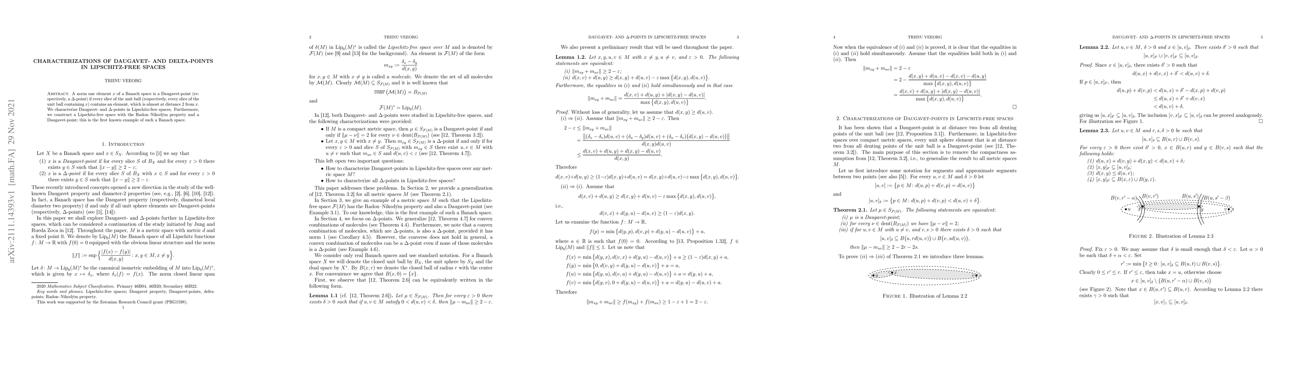 This paper characterizes Daugavet- and $\Delta$-points in Lipschitz-free spaces, identifying conditions under which norm one elements exhibit these properties. It also constructs the first Lipschitz-free space with a Radon-Nikod\'ym property and a Daugavet-point.