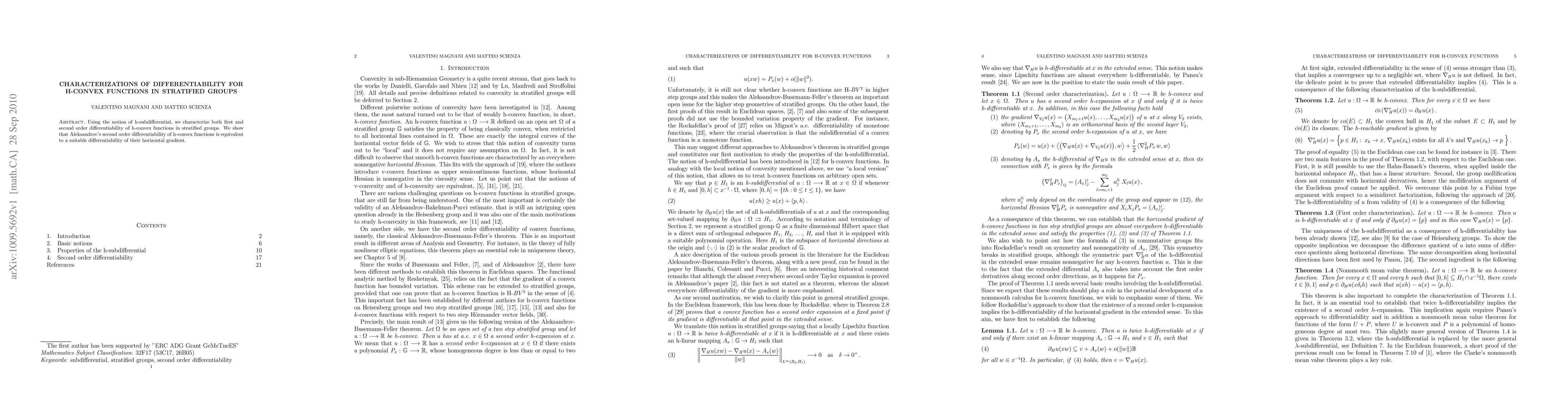 Summary: This paper characterizes first and second order differentiability of h-convex functions in stratified groups using h-subdifferentials. It demonstrates that Aleksandrov's second order differentiability is equivalent to the differentiability of the horizontal gradient of these functions.