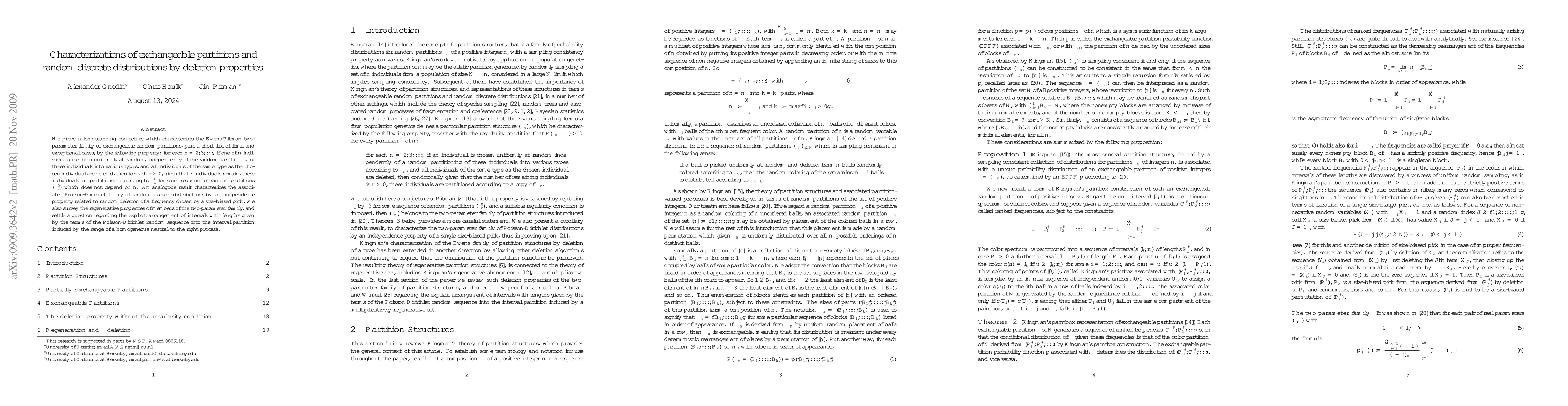 This paper proves a conjecture characterizing the Ewens-Pitman family of exchangeable random partitions via a deletion property, and similarly characterizes the Poisson-Dirichlet family of random discrete distributions through an independence property related to frequency deletion.