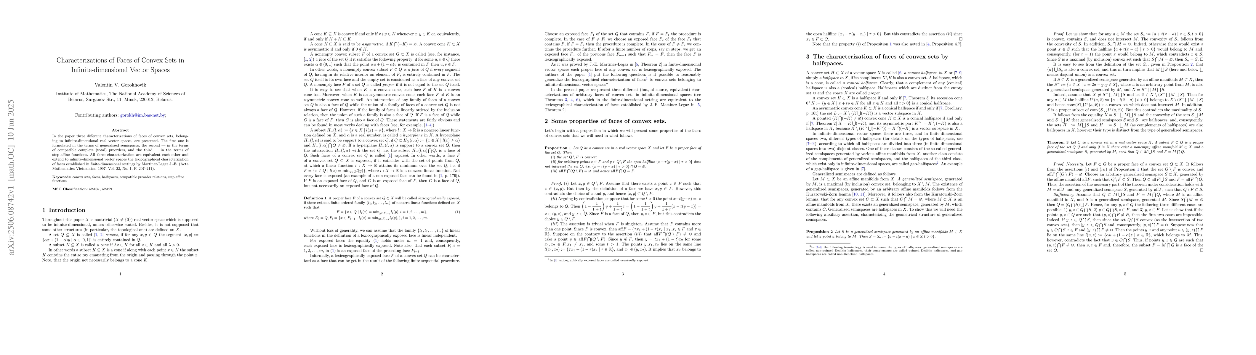 In the paper three different characterizations of faces of convex sets, belonging to infinite-dimensional real vector spaces, are presented. The first one is formulated in the terms of generalized semispaces, the second -- in the terms of compatible complete (total) preorders, and the third -- in the terms of step-affine functions. All three characterization are equivalent each other and extend to infinite-dimensional vector spaces the lexicographical characterization of faces established in finite-dimensional settings by Martinez-Legaz J.-E. (Acta Mathematica Vietnamica. 1997. Vol. 22, No.~1, P. 207--211).