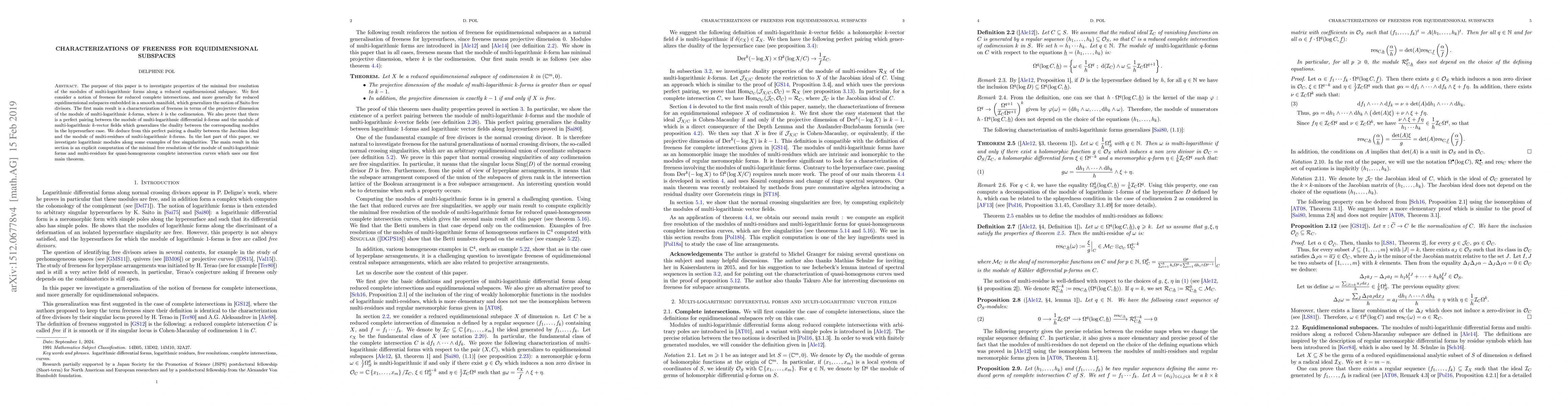 The purpose of this paper is to investigate properties of the minimal free resolution of the modules of multi-logarithmic forms along a reduced equidimensional subspace. We first consider a notion of freeness for reduced complete intersections, and more generally for reduced equidimensional subspaces embedded in a smooth manifold, which generalizes the notion of Saito free divisors. The first main result is a characterization of freeness in terms of the projective dimension of the module of multi-logarithmic k -forms, where k is the codimension. We also prove that there is a perfect pairing between the module of multi-logarithmic differential k -forms and the module of multi-logarithmic k -vector fields which generalizes the duality between the corresponding modules in the hypersurface case. We deduce from this perfect pairing a duality between the Jacobian ideal and the module of multi-residues of multi-logarithmic k -forms. In the last part of this paper, we investigate logarithmic modules along some examples of free singularities. The main result in this section is an explicit computation of the minimal free resolution of the module of multi-logarithmic forms and multi-residues for quasi-homogeneous complete intersection curves which uses our first main theorem.