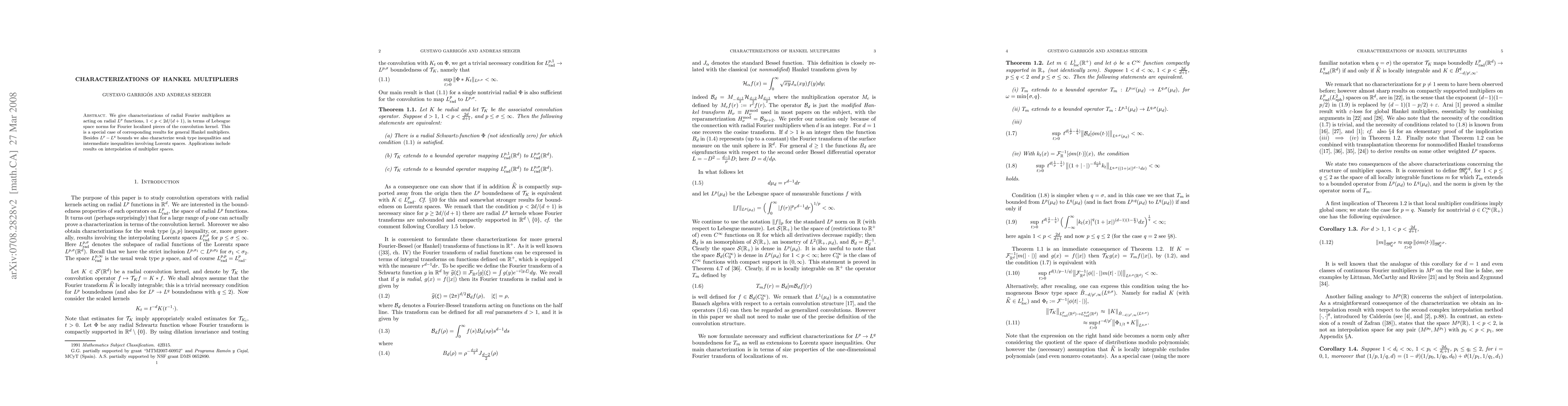 This paper characterizes radial Fourier multipliers acting on radial L^p-functions using Lebesgue space norms for localized convolution kernels. It extends these results to general Hankel multipliers, including L^p-L^q bounds, weak type inequalities, and Lorentz space characterizations, with applications to interpolation of multiplier spaces.