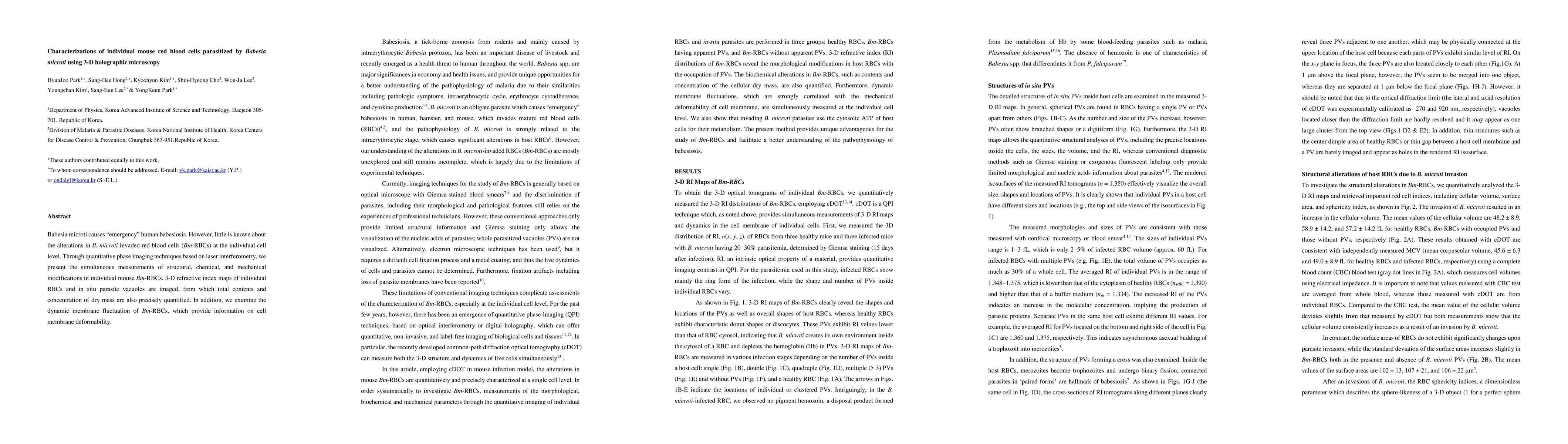 This study uses 3-D holographic microscopy to characterize individual mouse red blood cells parasitized by Babesia microti, revealing structural, chemical, and mechanical changes through quantitative phase imaging and refractive index mapping. The research also assesses dynamic membrane fluctuations to understand cell membrane deformability.