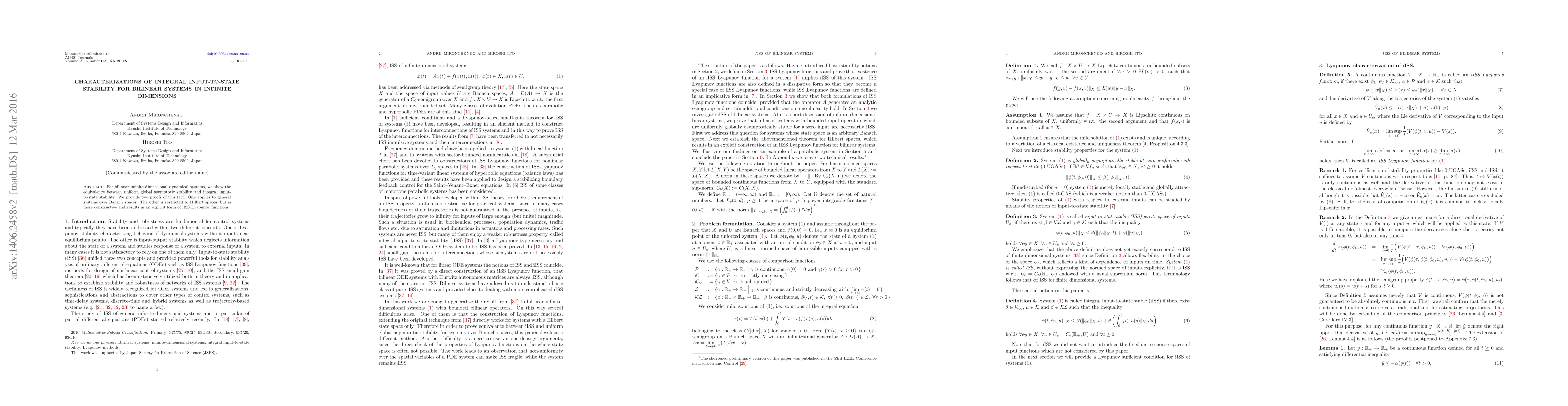 For bilinear infinite-dimensional dynamical systems, we show the equivalence between uniform global asymptotic stability and integral input-to-state stability. We provide two proofs of this fact. One applies to general systems over Banach spaces. The other is restricted to Hilbert spaces, but is more constructive and results in an explicit form of iISS Lyapunov functions.