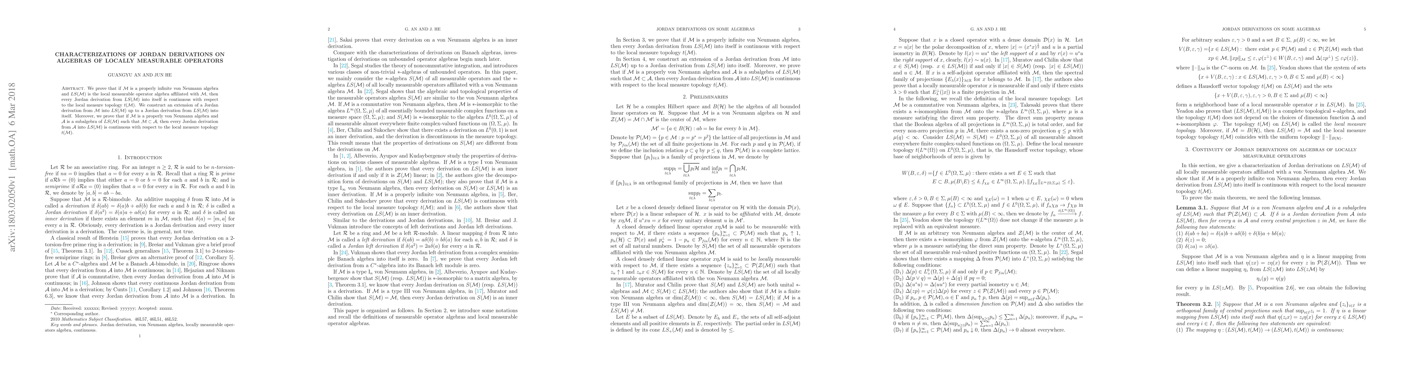 We prove that if $\mathcal M$ is a properly infinite von Neumann algebra and $LS(\mathcal M)$ is the local measurable operator algebra affiliated with $\mathcal M$, then every Jordan derivation from $LS(\mathcal M)$ into itself is continuous with respect to the local measure topology $t(\mathcal M)$. We construct an extension of a Jordan derivation from $\mathcal M$ into $LS(\mathcal M)$ up to a Jordan derivation from $LS(\mathcal M)$ into itself. Moreover, we prove that if $\mathcal M$ is a properly von Neumann algebra and $\mathcal A$ is a subalgebra of $LS(\mathcal M)$ such that $\mathcal M\subset\mathcal A$, then every Jordan derivation from $\mathcal A$ into $LS(\mathcal M)$ is continuous with respect to the local measure topology $t(\mathcal M)$.