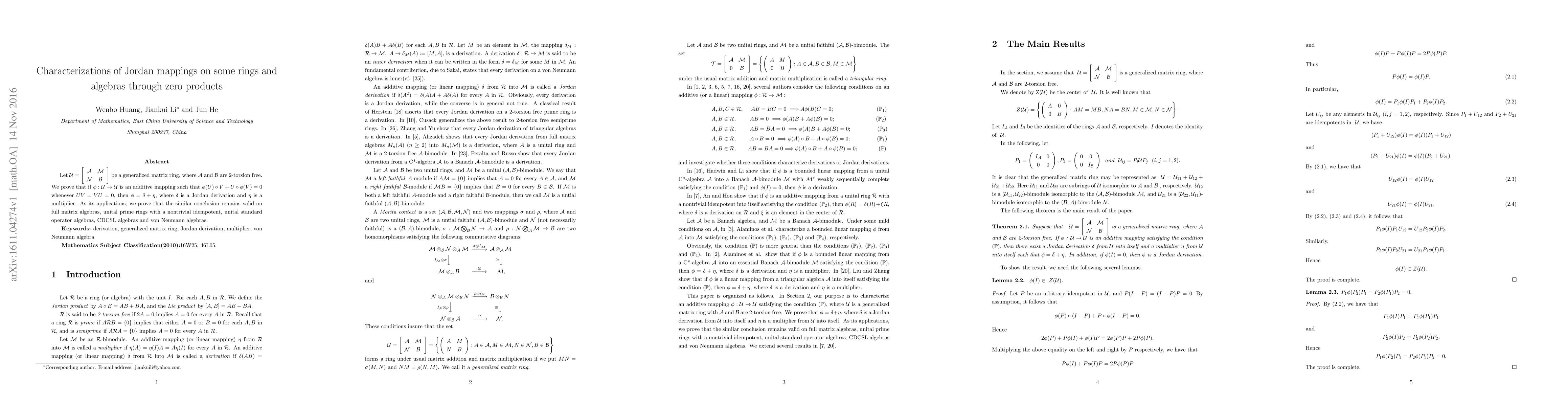 Let $\mathcal{U}=\left[ \begin{array}{cc} \mathcal{A} & \mathcal{M} \mathcal{N}& \mathcal{B} \end{array} \right]$ be a generalized matrix ring, where $\mathcal{A}$ and $\mathcal{B}$ are 2-torsion free. We prove that if $\phi :\mathcal{U}\rightarrow \mathcal{U}$ is an additive mapping such that $\phi(U)\circ V+U\circ \phi(V)=0$ whenever $UV=VU=0,$ then $\phi=\delta+\eta$, where $\delta$ is a Jordan derivation and $\eta$ is a multiplier. As its applications, we prove that the similar conclusion remains valid on full matrix algebras, unital prime rings with a nontrivial idempotent, unital standard operator algebras, CDCSL algebras and von Neumann algebras.