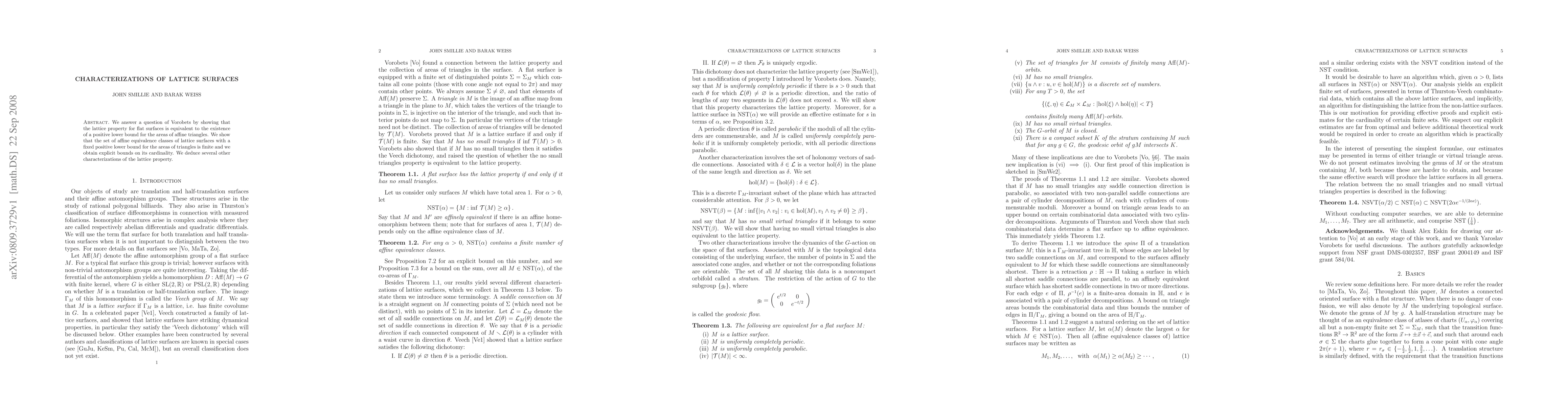 We answer a question of Vorobets by showing that the lattice property for flat surfaces is equivalent to the existence of a positive lower bound for the areas of affine triangles. We show that the set of affine equivalence classes of lattice surfaces with a fixed positive lower bound for the areas of triangles is finite and we obtain explicit bounds on its cardinality. We deduce several other characterizations of the lattice property.
