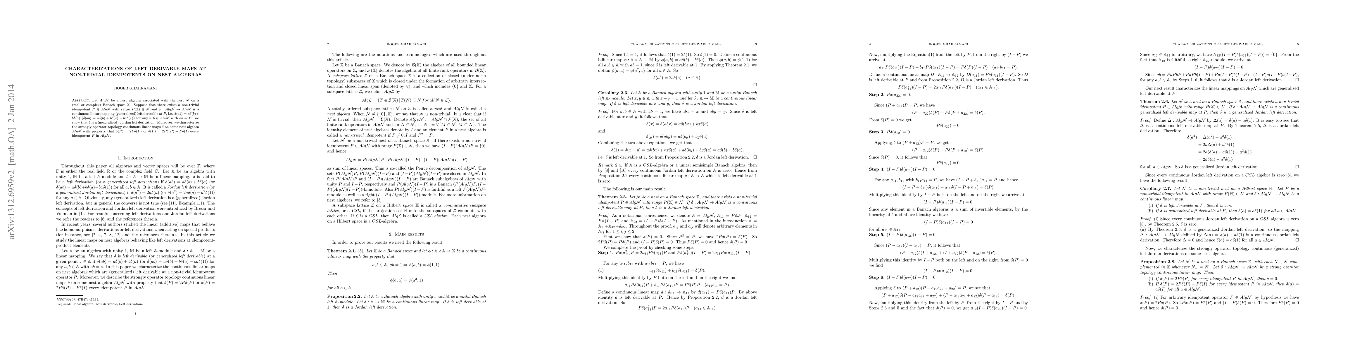 This paper explores left derivable maps in nest algebras, a type of Banach algebra. It demonstrates that if a continuous linear map is (generalized) left derivable at a non-trivial idempotent, it is a Jordan left derivation. The research also characterizes strongly operator topology continuous linear maps satisfying specific conditions involving idempotents in nest algebras.