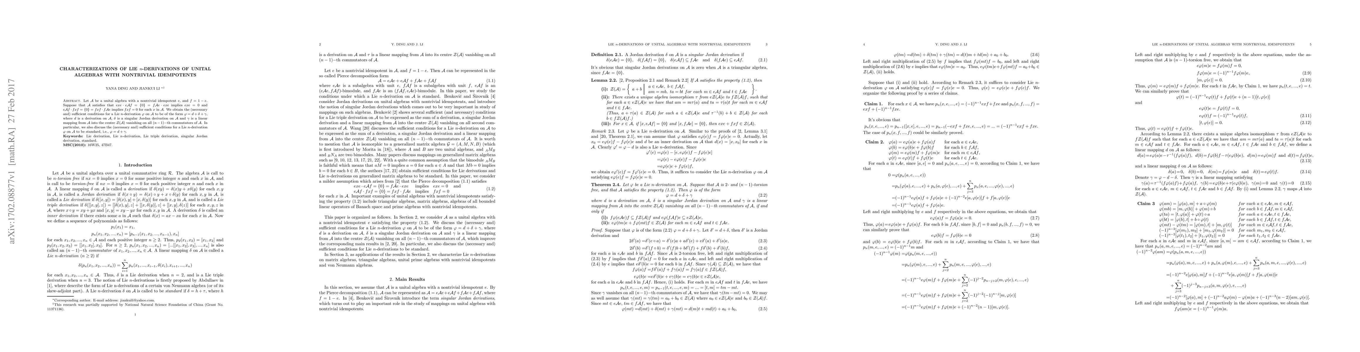 Let A be a unital algebra with a nontrivial idempotent e, and f=1-e. Suppose that A satisfies that exe.eAf={0}=fAe.exe implies exe=0 and eAf.fxf={0}=fxf.fAe implies fxf=0 for each x in A. We obtain the (necessary and) sufficient conditions for a Lie n-derivation {\phi} on A to be of the form {\phi}=d+{\delta}+{\gamma}, where d is a derivation on A, {\delta} is a singular Jordan derivation on A and {\gamma} is a linear mapping from A into the centre Z(A) vanishing on all (n-1)-th commutators of A. In particular, we also discuss the (necessary and) sufficient conditions for a Lie n-derivation {\phi} on A to be standard, i.e., {\phi}=d+{\gamma}.