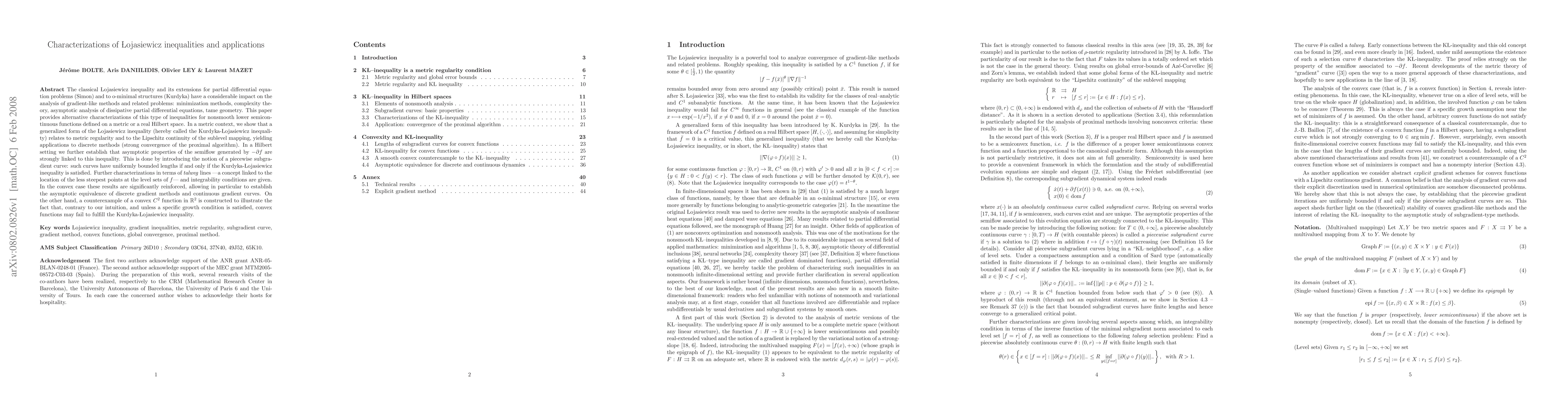 The classical Lojasiewicz inequality and its extensions for partial differential equation problems (Simon) and to o-minimal structures (Kurdyka) have a considerable impact on the analysis of gradient-like methods and related problems: minimization methods, complexity theory, asymptotic analysis of dissipative partial differential equations, tame geometry. This paper provides alternative characterizations of this type of inequalities for nonsmooth lower semicontinuous functions defined on a metric or a real Hilbert space. In a metric context, we show that a generalized form of the Lojasiewicz inequality (hereby called the Kurdyka-Lojasiewicz inequality) relates to metric regularity and to the Lipschitz continuity of the sublevel mapping, yielding applications to discrete methods (strong convergence of the proximal algorithm). In a Hilbert setting we further establish that asymptotic properties of the semiflow generated by $-\partial f$ are strongly linked to this inequality. This is done by introducing the notion of a piecewise subgradient curve: such curves have uniformly bounded lengths if and only if the Kurdyka-Lojasiewicz inequality is satisfied. Further characterizations in terms of talweg lines -a concept linked to the location of the less steepest points at the level sets of $f$- and integrability conditions are given. In the convex case these results are significantly reinforced, allowing in particular to establish the asymptotic equivalence of discrete gradient methods and continuous gradient curves. On the other hand, a counterexample of a convex C^2 function in in the plane is constructed to illustrate the fact that, contrary to our intuition, and unless a specific growth condition is satisfied, convex functions may fail to fulfill the Kurdyka-Lojasiewicz inequality.