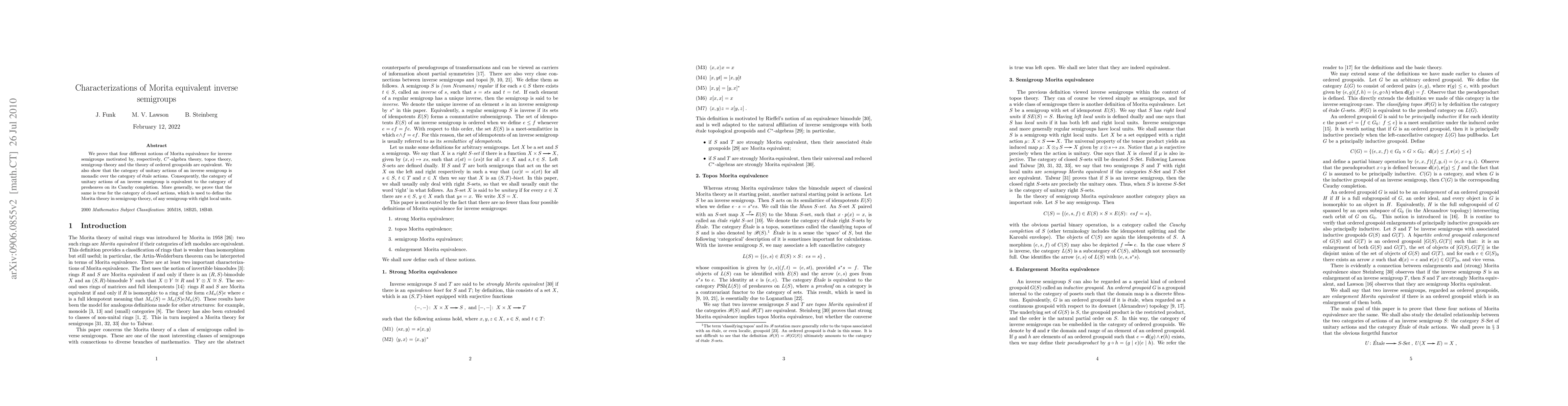 We prove that four different notions of Morita equivalence for inverse semigroups motivated by, respectively, $C^{\ast}$-algebra theory, topos theory, semigroup theory and the theory of ordered groupoids are equivalent. We also show that the category of unitary actions of an inverse semigroup is monadic over the category of \'etale actions. Consequently, the category of unitary actions of an inverse semigroup is equivalent to the category of presheaves on its Cauchy completion. More generally, we prove that the same is true for the category of closed actions, which is used to define the Morita theory in semigroup theory, of any semigroup with right local units.