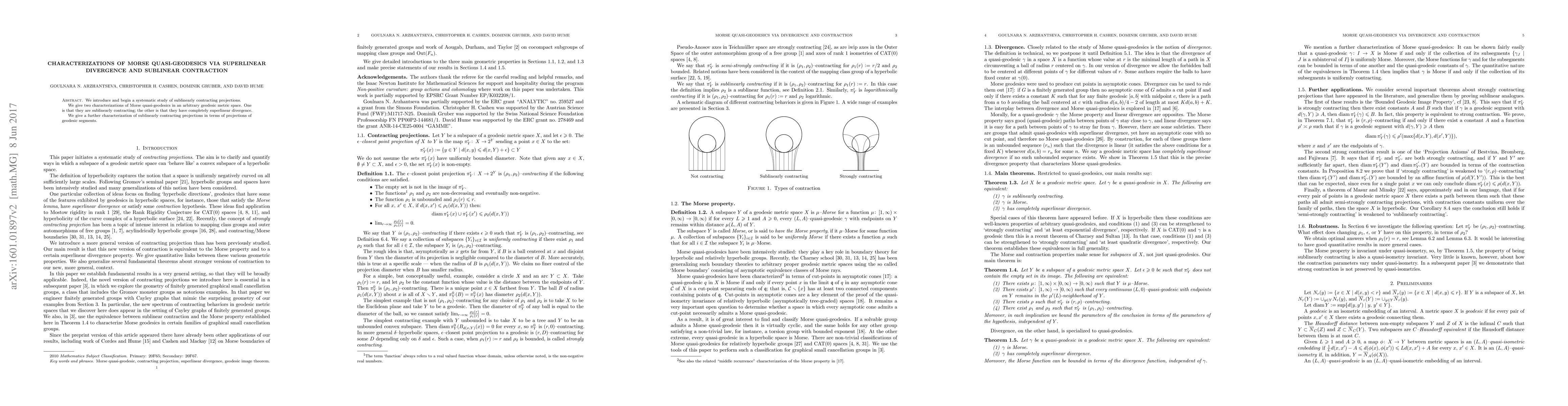 We introduce and begin a systematic study of sublinearly contracting projections. We give two characterizations of Morse quasi-geodesics in an arbitrary geodesic metric space. One is that they are sublinearly contracting; the other is that they have completely superlinear divergence. We give a further characterization of sublinearly contracting projections in terms of projections of geodesic segments.