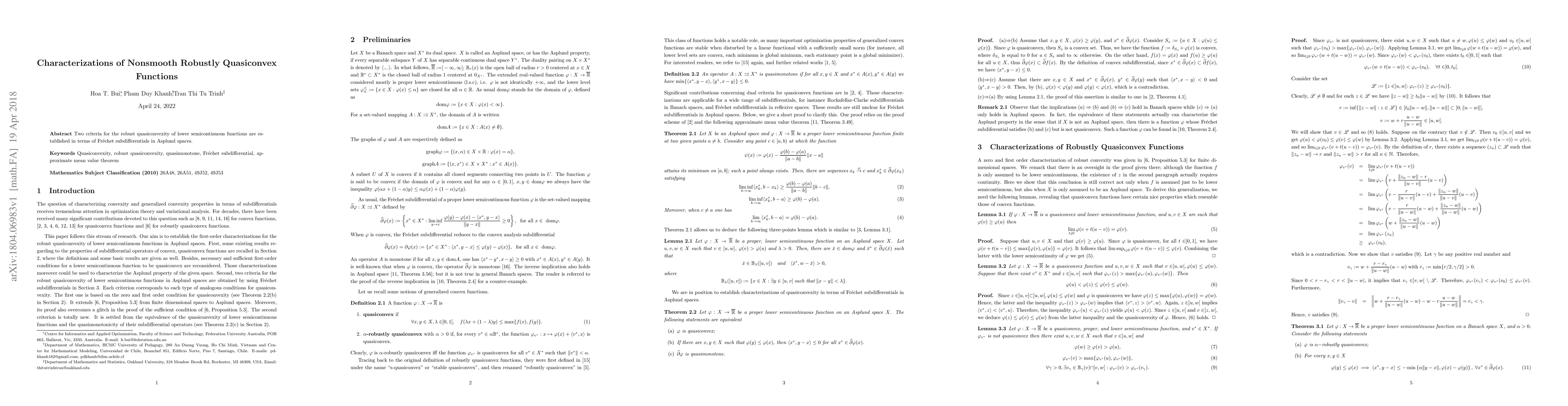 Two criteria for the robust quasiconvexity of lower semicontinuous functions are established in terms of Fr\'echet subdifferentials in Asplund spaces.