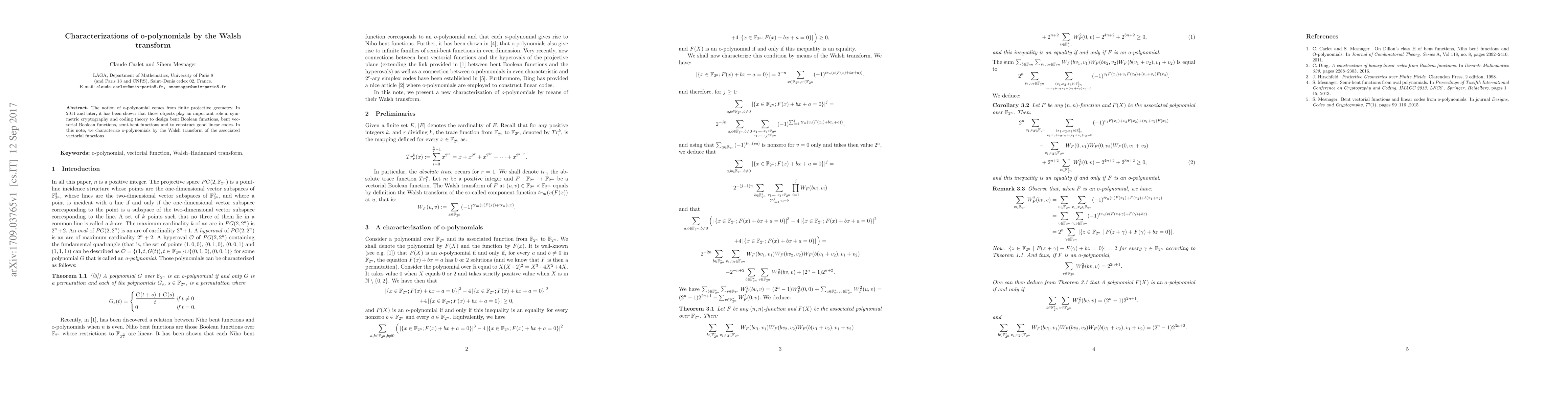 This paper explores the characterization of o-polynomials, originating from finite projective geometry, through the Walsh transform of associated vectorial functions. The study highlights their significance in symmetric cryptography and coding theory for designing bent functions and constructing good linear codes.
