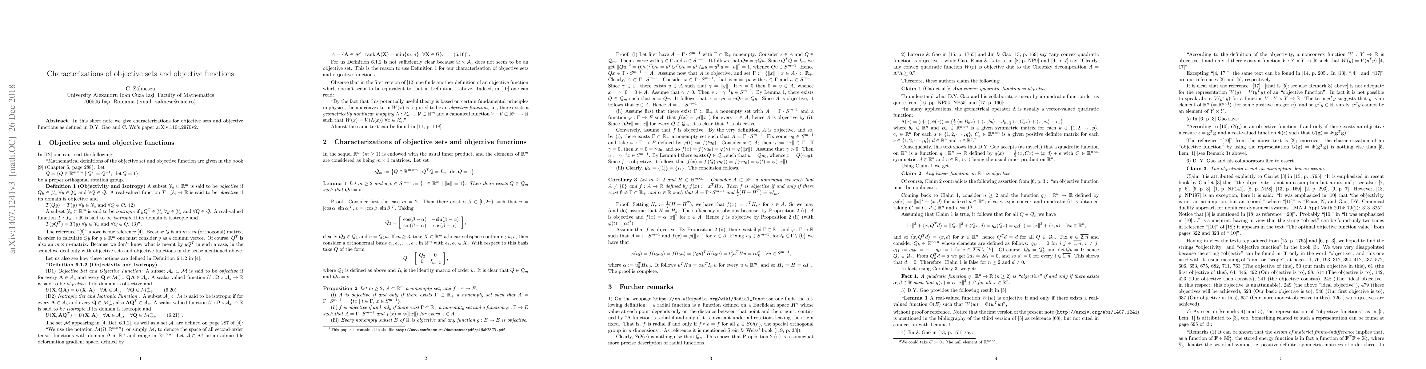 In this short note we give characterizations for objective sets and objective functions as defined in D. Y. Gao and C. Wu's paper arxiv:1104.2970v2.