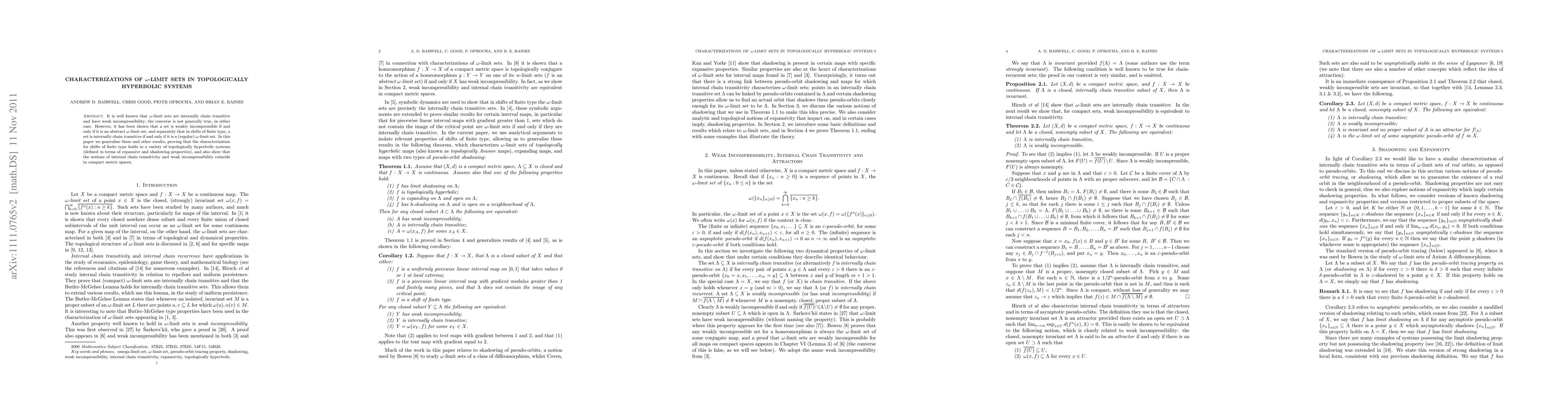 It is well known that \omega-limit sets are internally chain transitive and have weak incompressibility; the converse is not generally true, in either case. However, it has been shown that a set is weakly incompressible if and only if it is an abstract \omega-limit set, and separately that in shifts of finite type, a set is internally chain transitive if and only if it is a (regular) \omega-limit set. In this paper we generalise these and other results, proving that the characterization for shifts of finite type holds in a variety of topologically hyperbolic systems (defined in terms of expansive and shadowing properties), and also show that the notions of internal chain transitivity and weak incompressibility coincide in compact metric spaces.